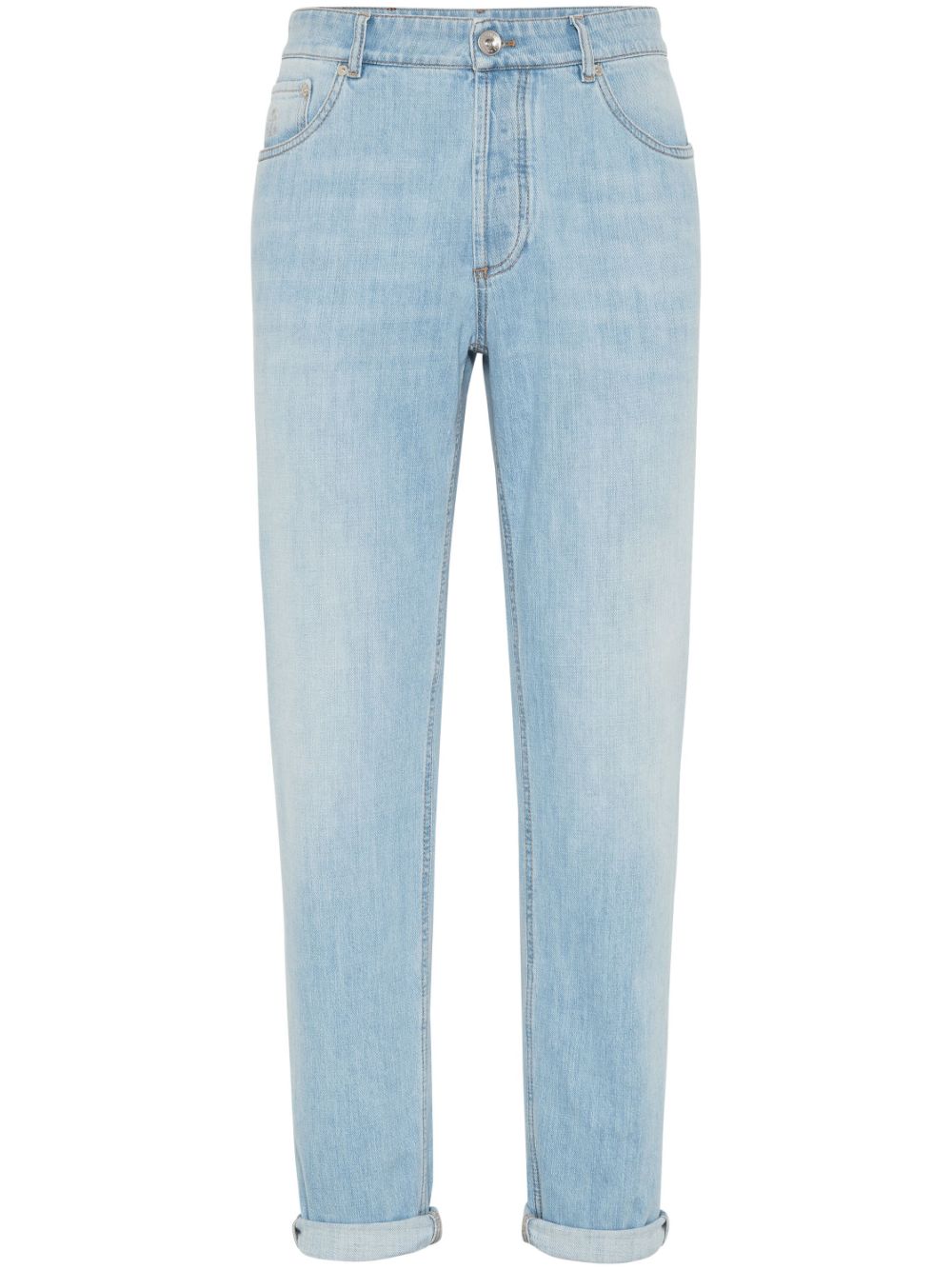 Slim-cut cotton jeans from BRUNELLO CUCINELLI featuring front button and zip fastening, classic five pockets, light blue, cotton, slim cut, logo patch to the rear, mid-rise and belt loops.