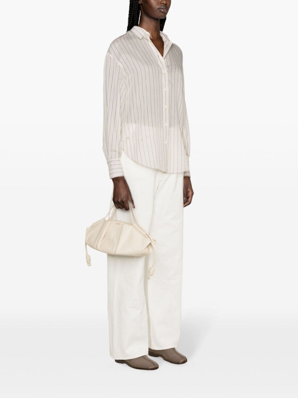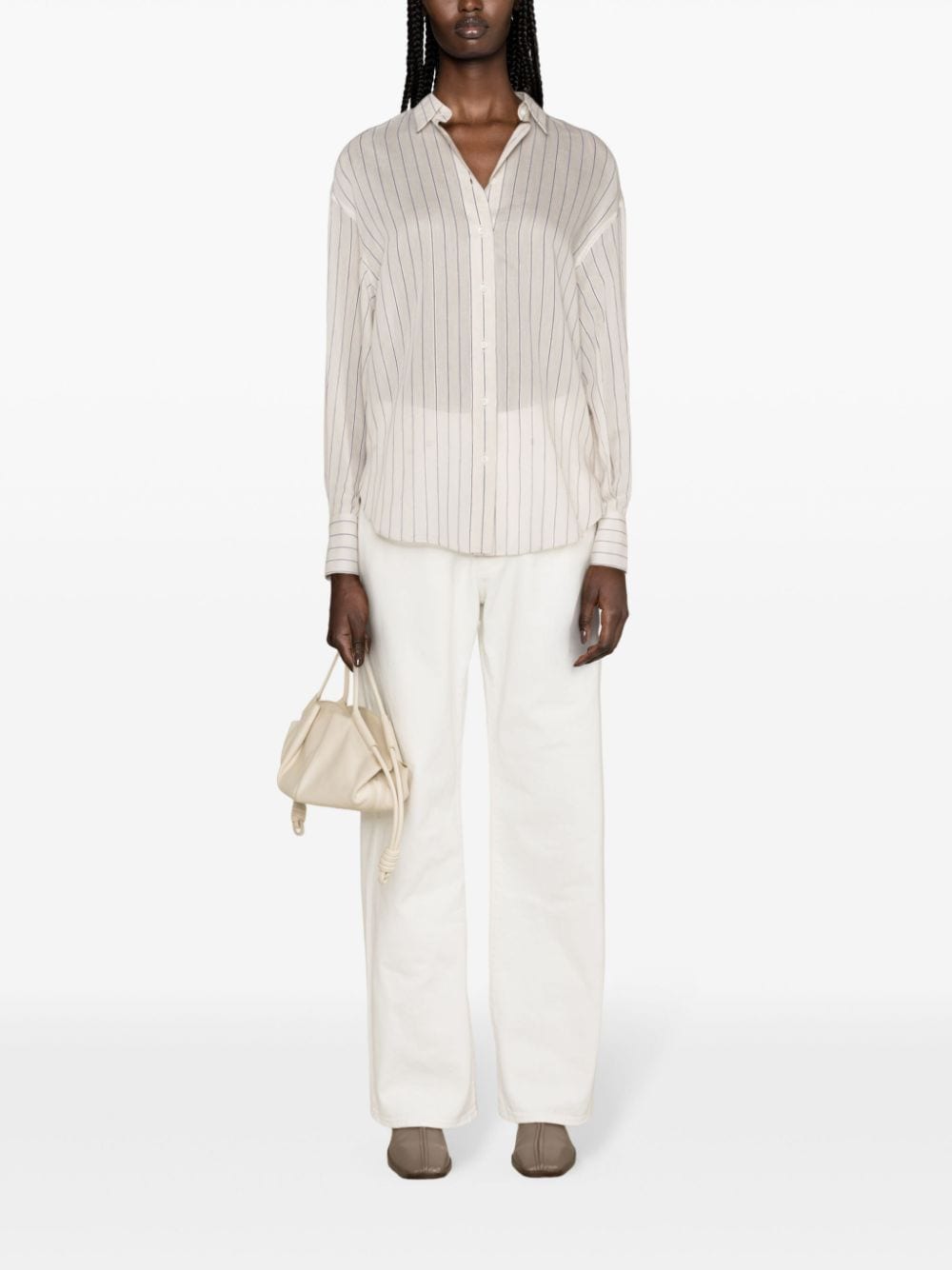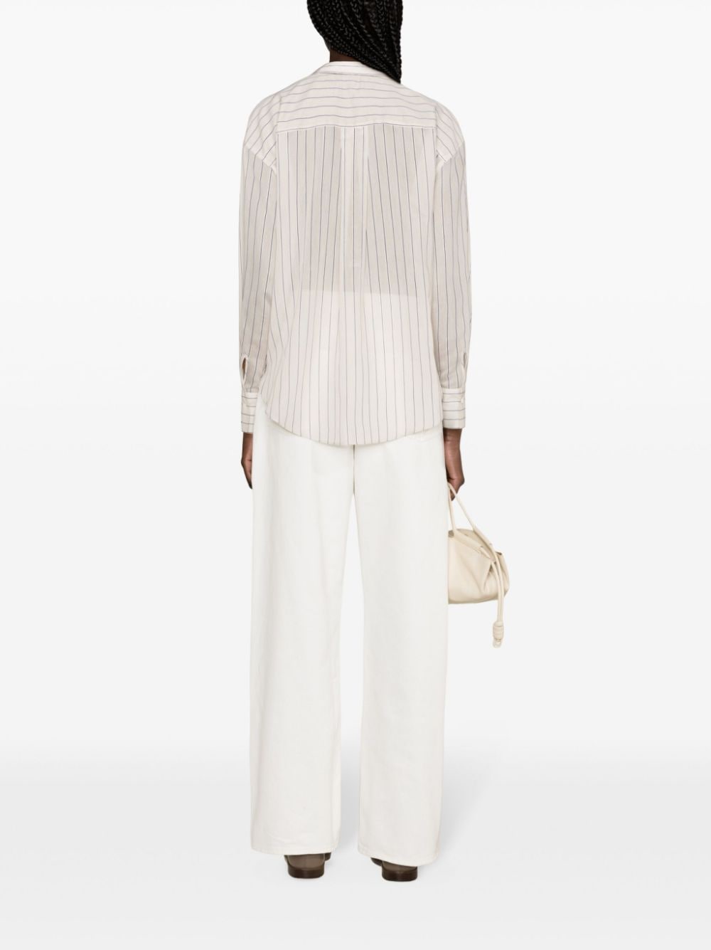 مزيج من القطن باللون البيج، هيكل شبه شفاف، نمط شريط عمودي، تفاصيل من اللوريكس، ياقة مستقيمة، زر أمامي للإغلاق، أكمام طويلة، وأساور بأزرار، وحاشية منحنية