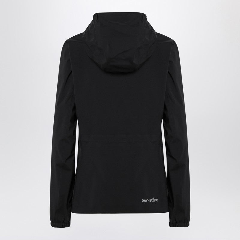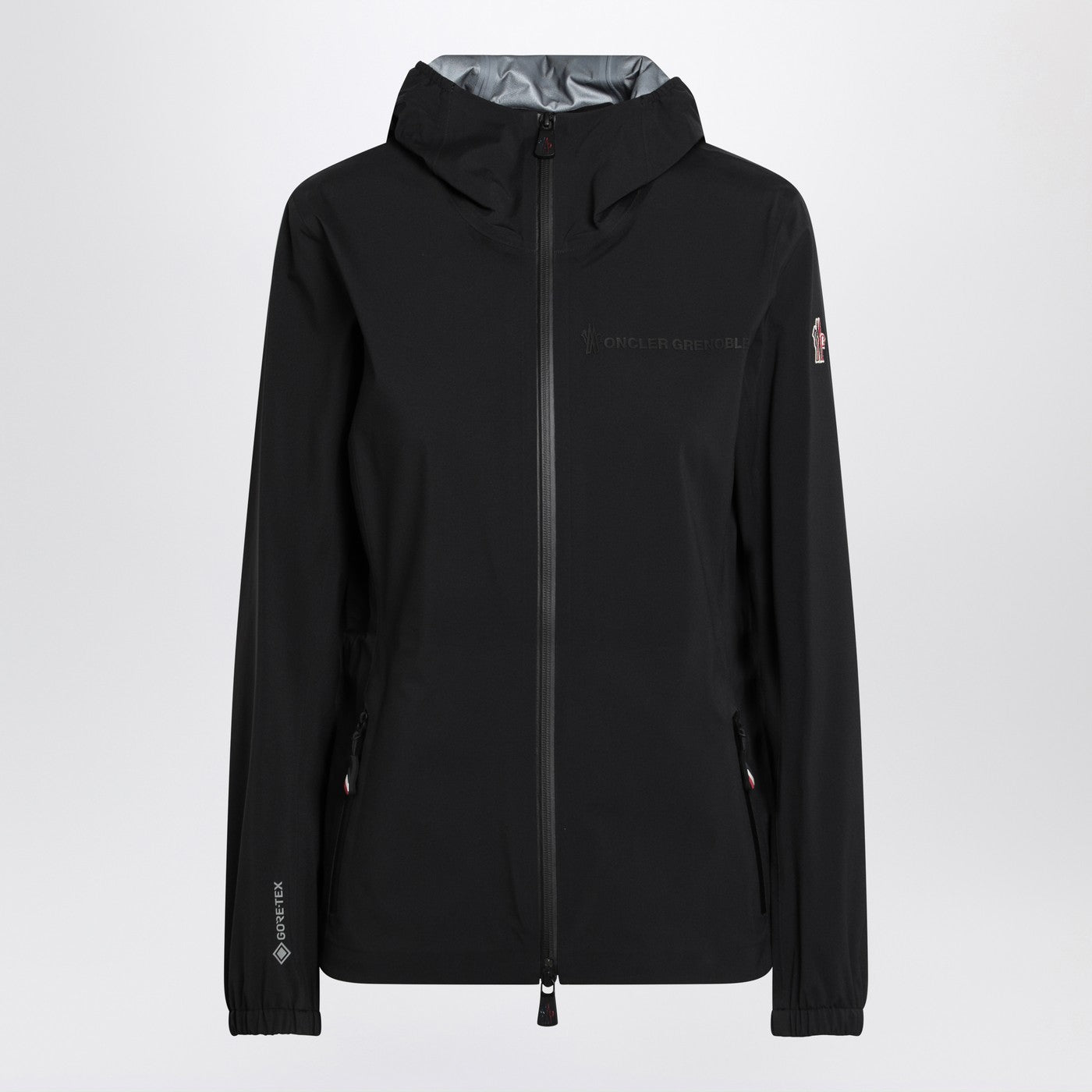 Moncler Grenoble black stretch ripstop hooded jacket, featuring a front closure with double zip, long sleeves with elasticated cuffs, one with logo patch, two zip pockets, and logo lettering on the chest.