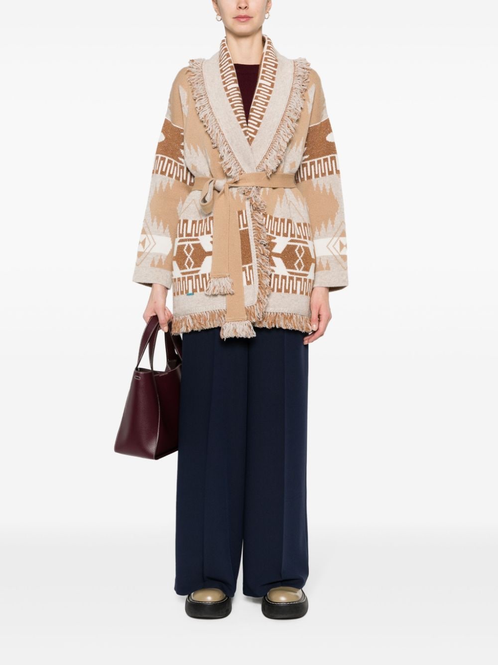 مزيج الكشمير البيج منقوشة من قماش الجاكار بحافة مهترئة مفتوحة من الأمام وخصر مربوط وأكمام طويلة وحاشية مستقيمة