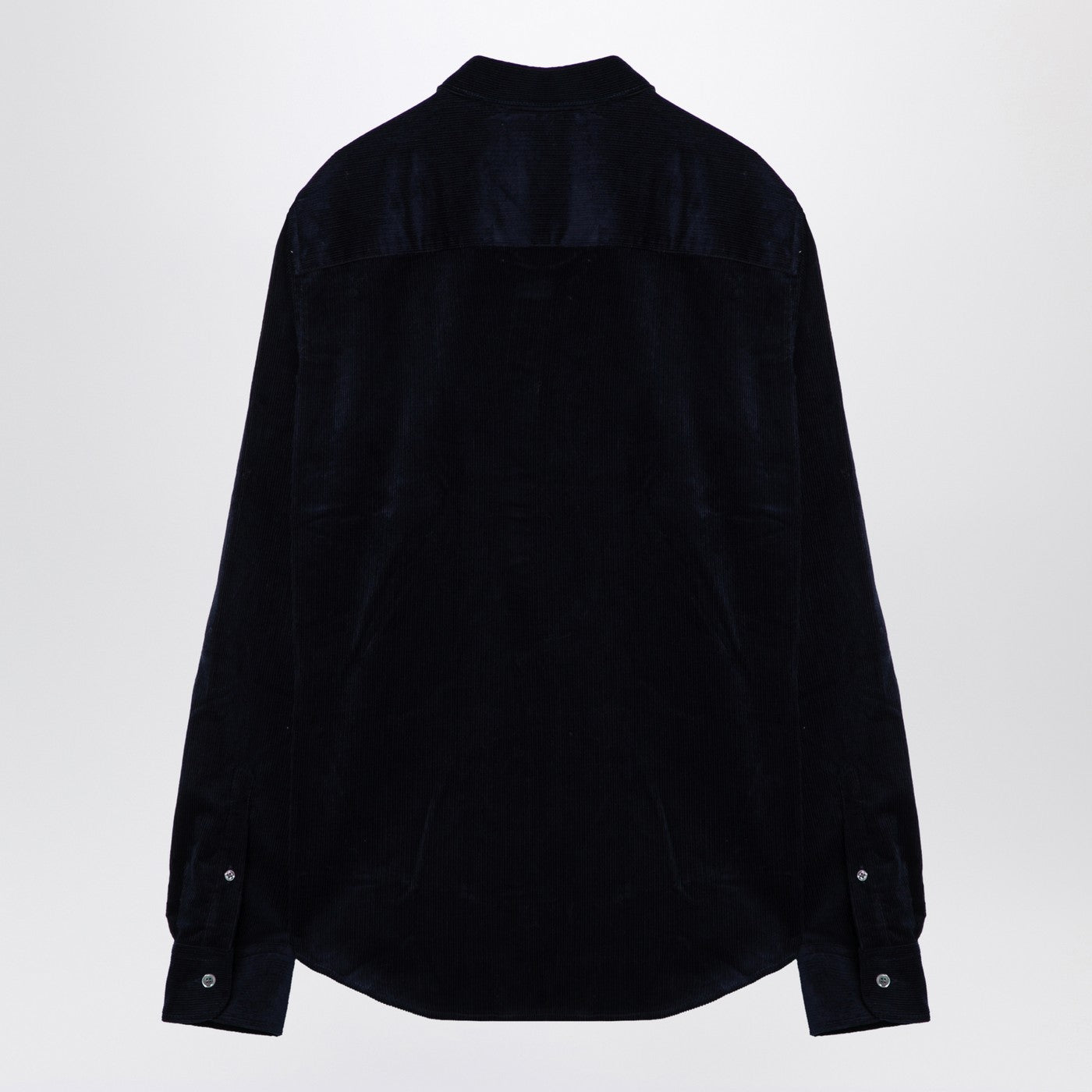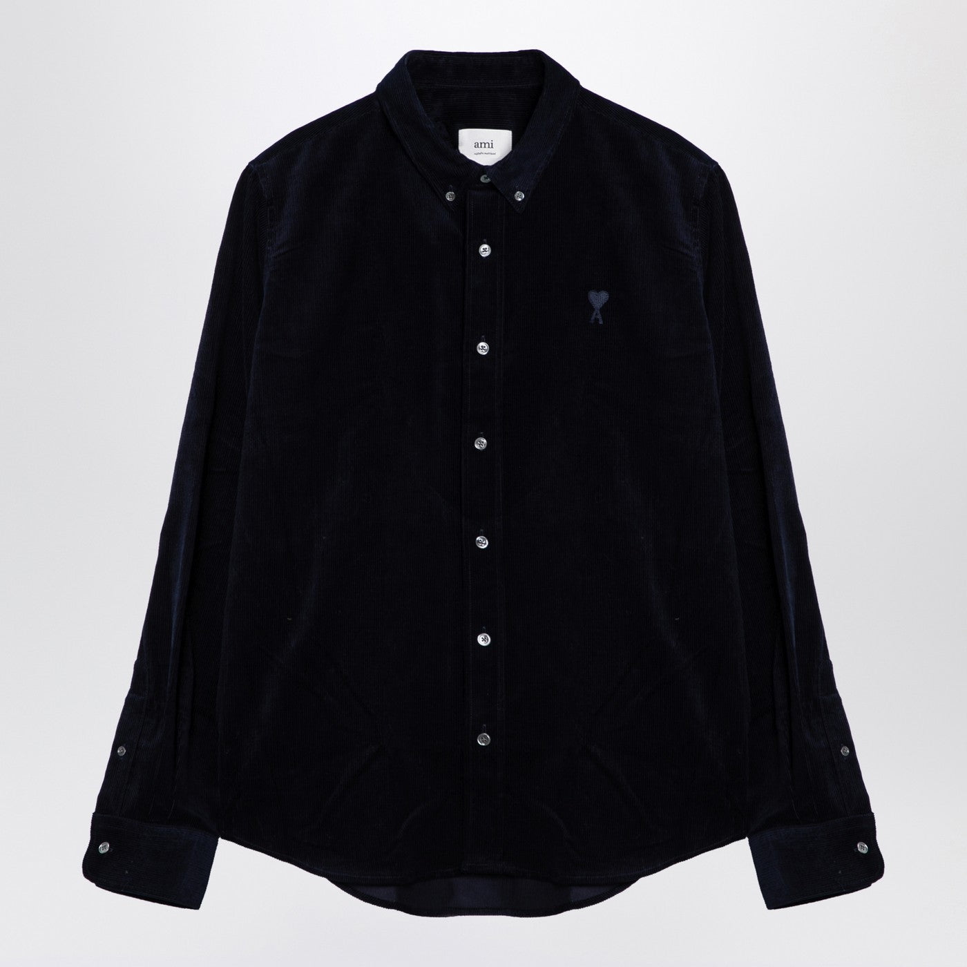 قميص من تصميم Ami Paris، مصنوع من المخمل المضلع باللون الأزرق الداكن، ويتميز بياقة بأزرار سفلية وغلق بزر أمامي وأكمام طويلة وأساور بأزرار وحاشية منحنية وتطريز Ami De Coeur بألوان متباينة على الصدر.