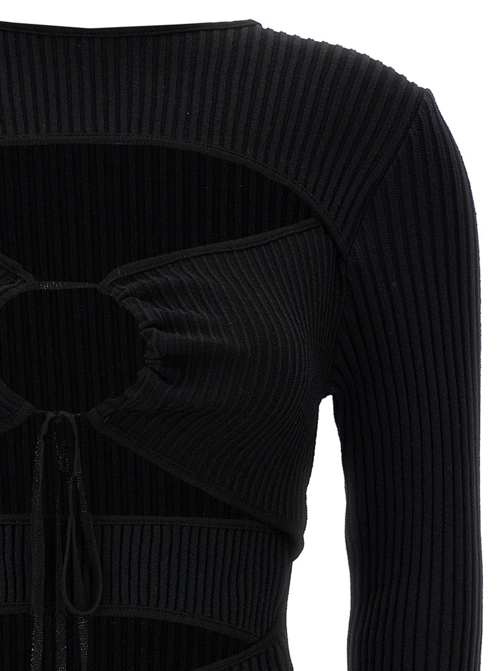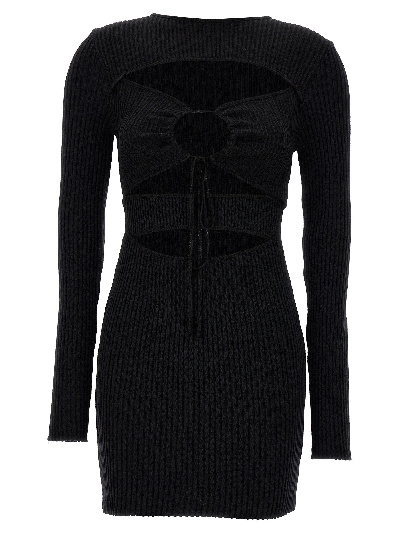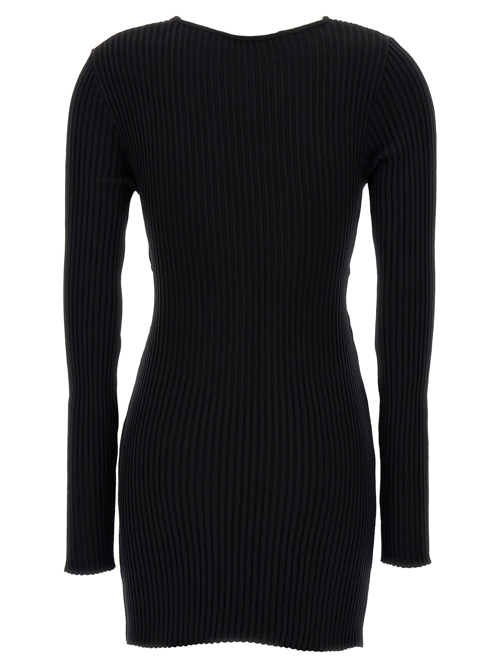 فستان "Ribbed Knit Mini" من مزيج القطن المضلع مع رقبة دائرية وأكمام طويلة وتفاصيل فتحات أمامية وأربطة.