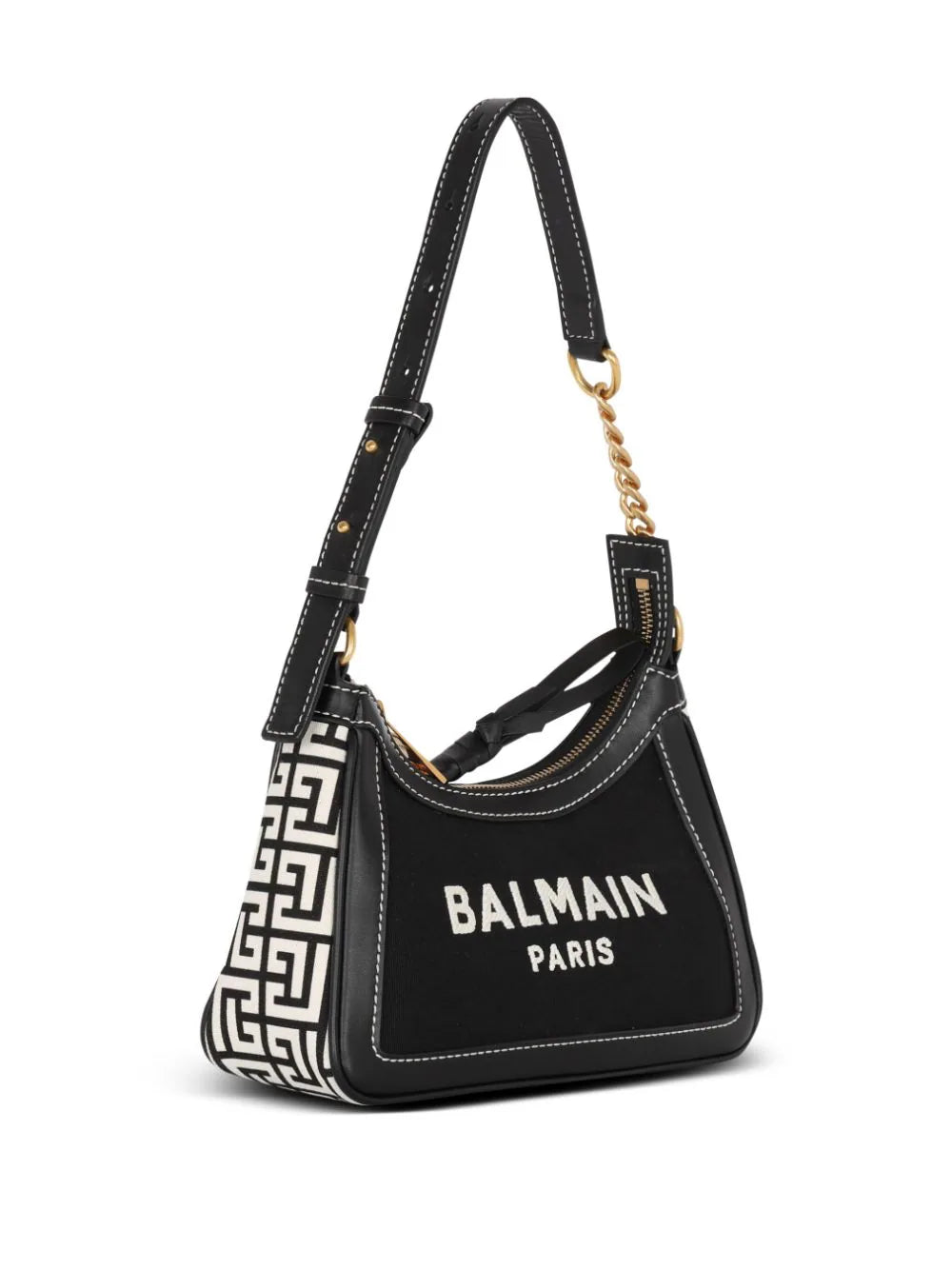 أسود/أبيض، قطن/جلد، جاكار مع حرف واحد فقط، شعار متدفق، خياطة متباينة، مقبض قابل للتعديل، إغلاق بسحاب علوي، حجرة واحدة وفتحة داخلية للبطاقات.