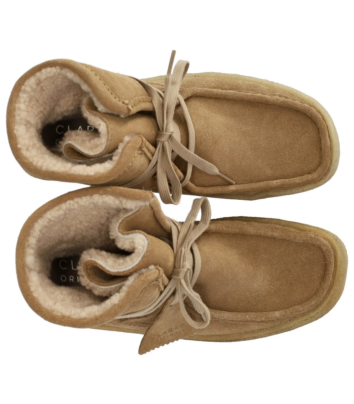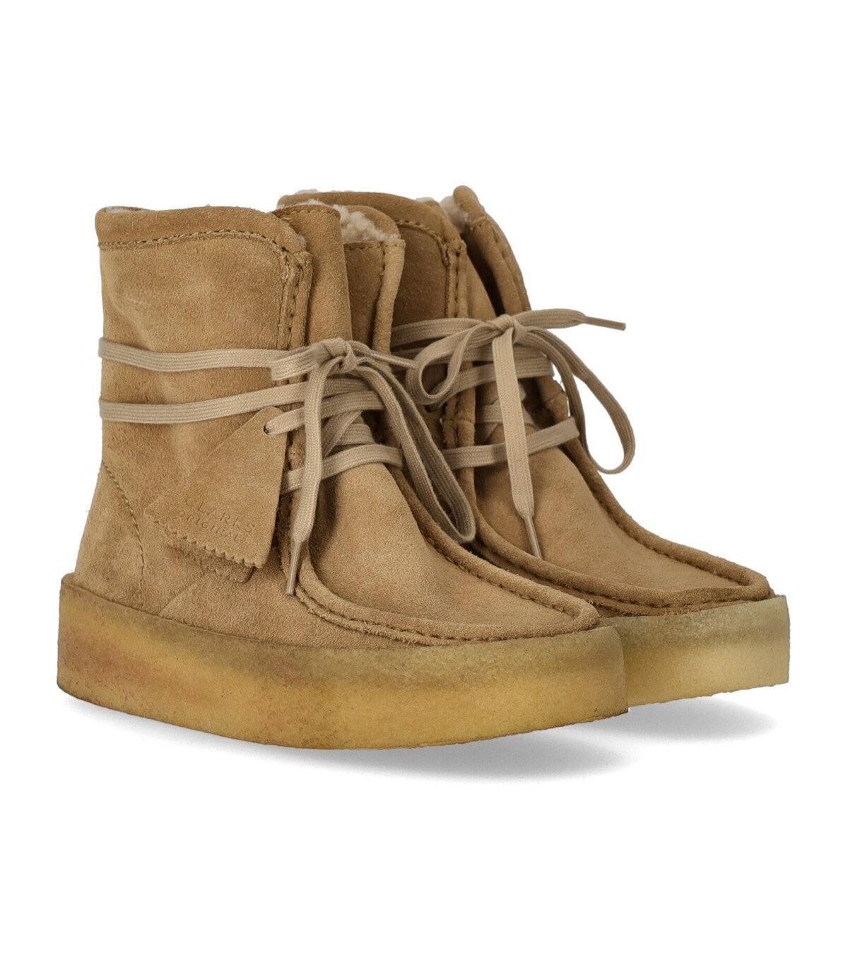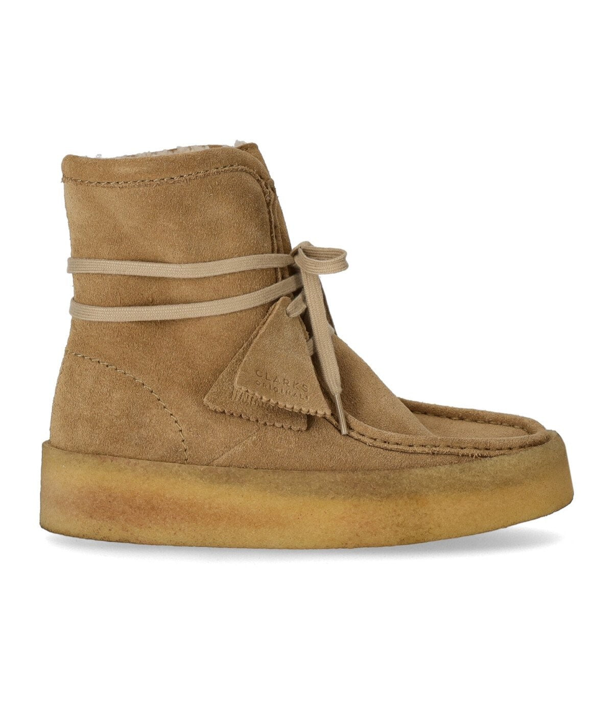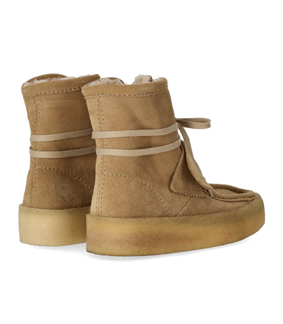 حذاء Clarks Wallabee Cup Hi مصنوع من جلد سويدي ناعم باللون البيج، مع بطانة من الفرو الصناعي ونعل داخلي من الجلد. مقدمة مربعة ونعل كريب، ارتفاع 4 سم.