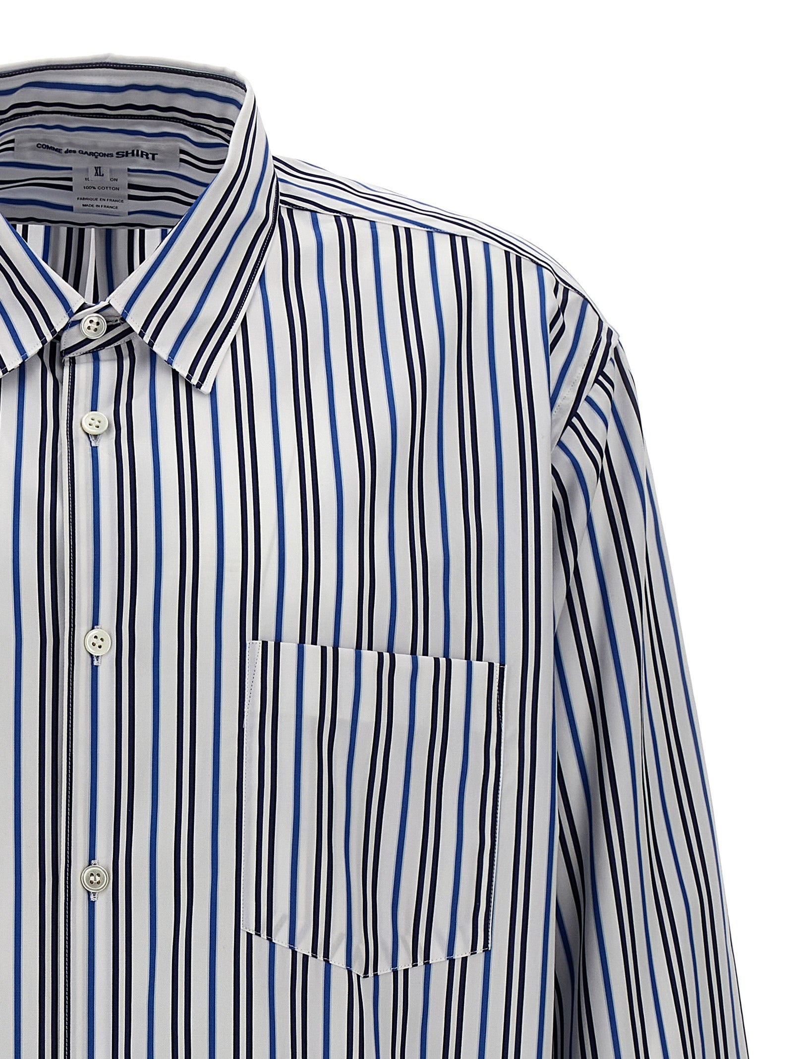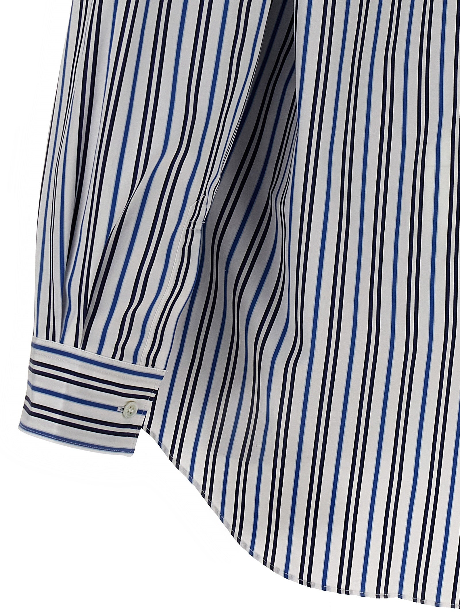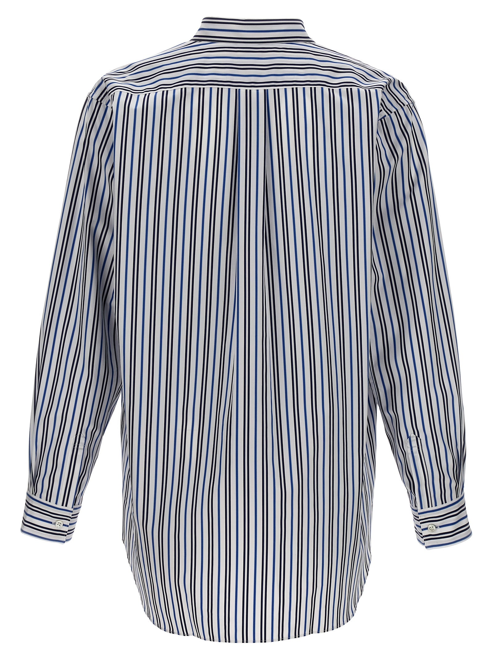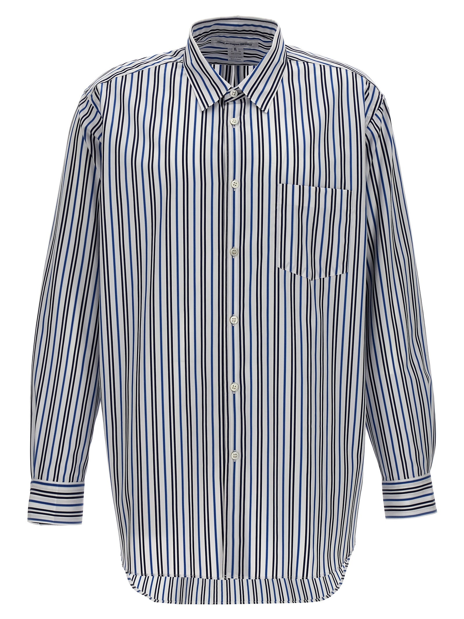 قميص قطن مخطط بجيب أمامي، زر للإغلاق، وأكمام طويلة بأساور.