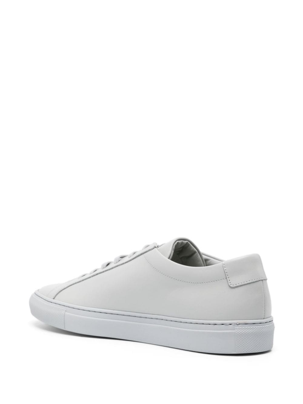 حذاء رياضي جلد منخفض من تصميم COMMON PROJECTS، يتميز هذا المنتج باللون الرمادي الفاتح وجلد العجل وغلق برباط أمامي ومقدمة قدم مستديرة وحروف شعار بإضاءة ذهبية ونعل داخلي جلد بعلامة تجارية ونعل مطاطي مسطح.
