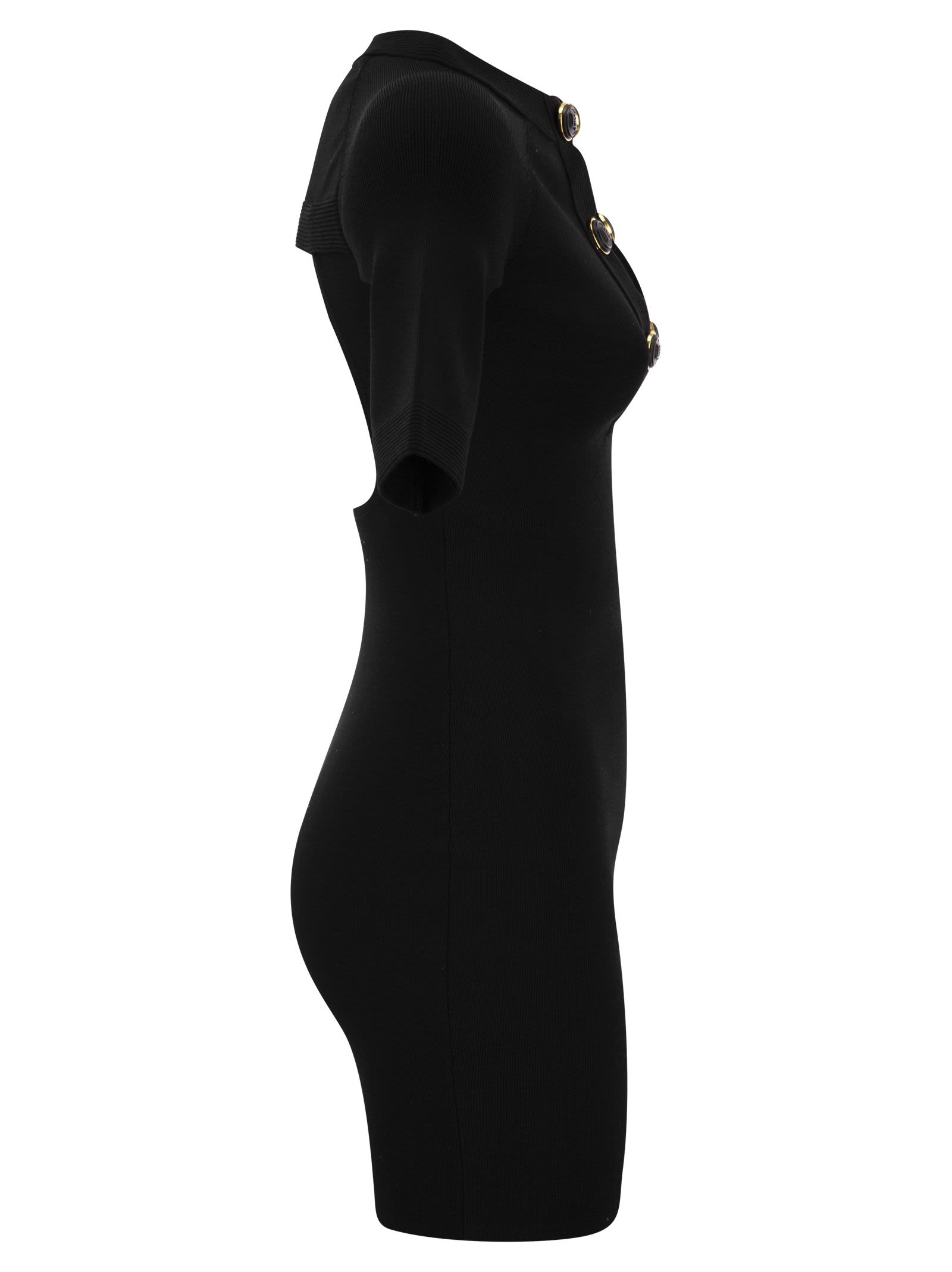 فستان قصير من الفيسكوز اللامع مع زخرفة بفتحات على الظهر. يتميز بخط عنق عميق مغلق بواسطة أزرار مزدوجة متطابقة. - سحاب غير مرئي على الجانب - أزرار متناسقة - مقاس محكم هوية المصمم: AM70S41E2 110