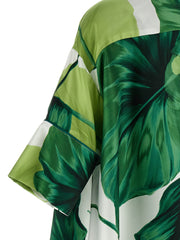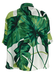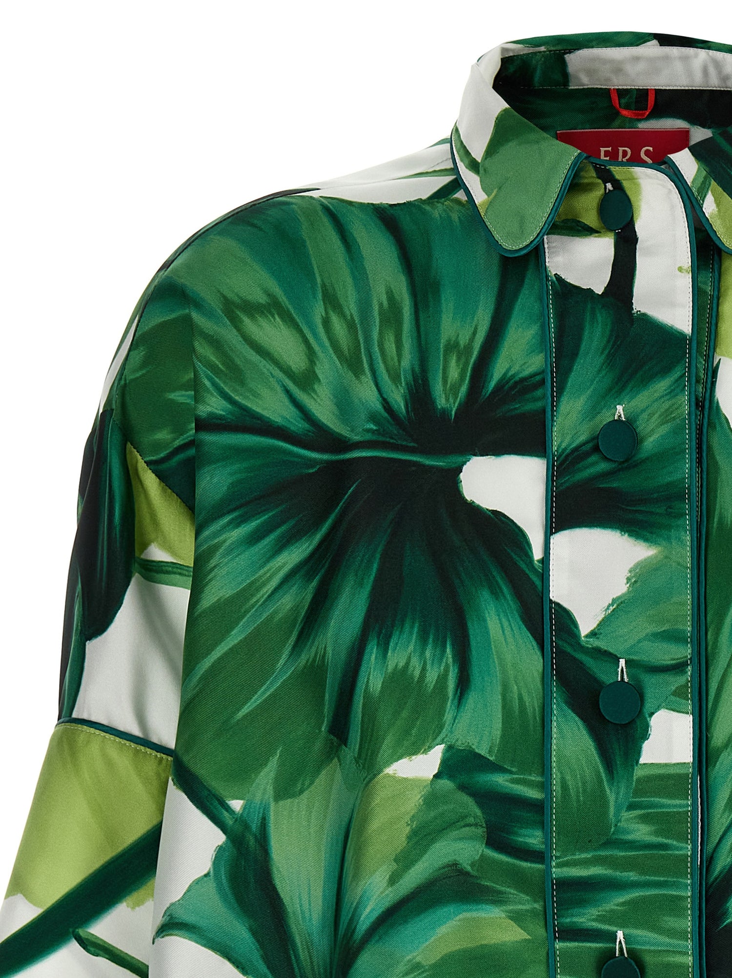 قميص "Pistis" من نسيج التويل الحريري بطبعات الأزهار مع تفاصيل من الساتان الصلب، وياقة رجالية، وزر للإغلاق، وأكمام 3/4 مع أكتاف منسدلة، وحاشية غير متماثلة.