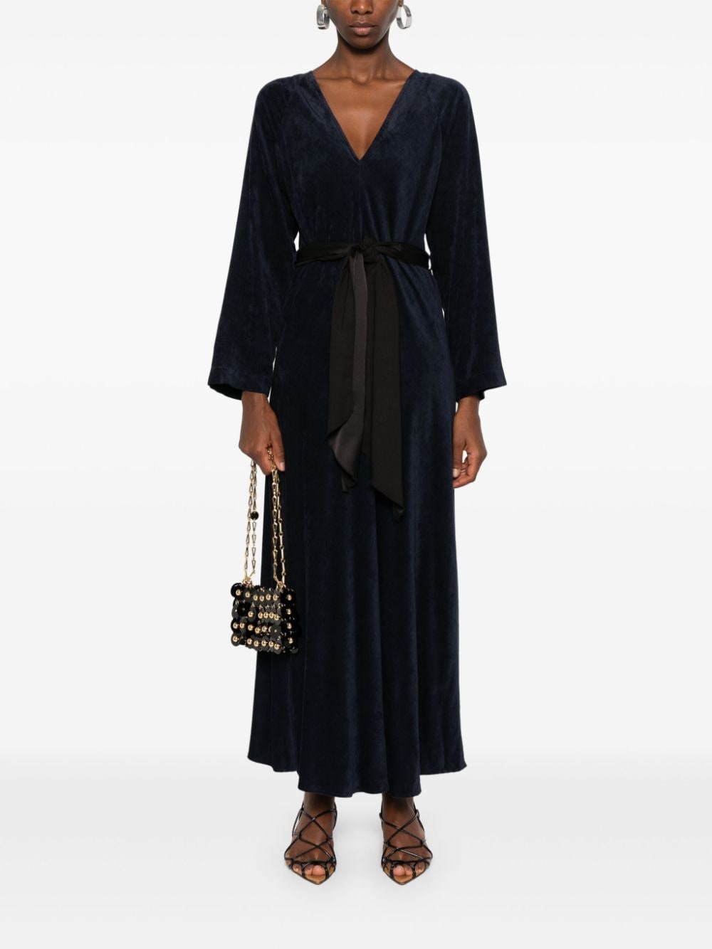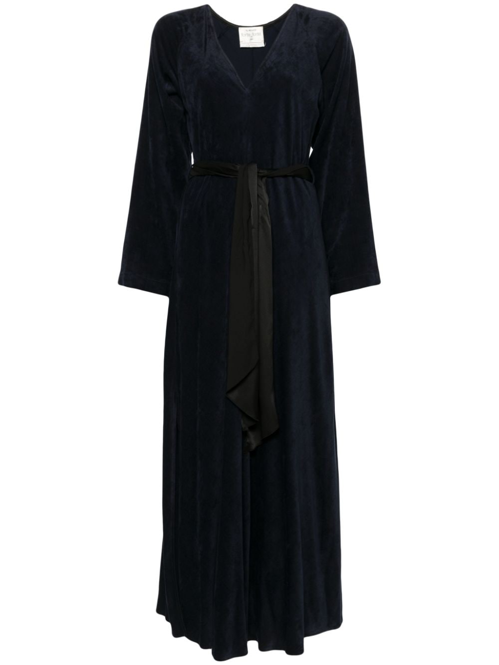 أزرق منتصف الليل مخملي برقبة على شكل حرف V وأكمام طويلة وحلقات للحزام وحزام قابل للفصل وحاشية منحنية وطول طويل غير مبطن
