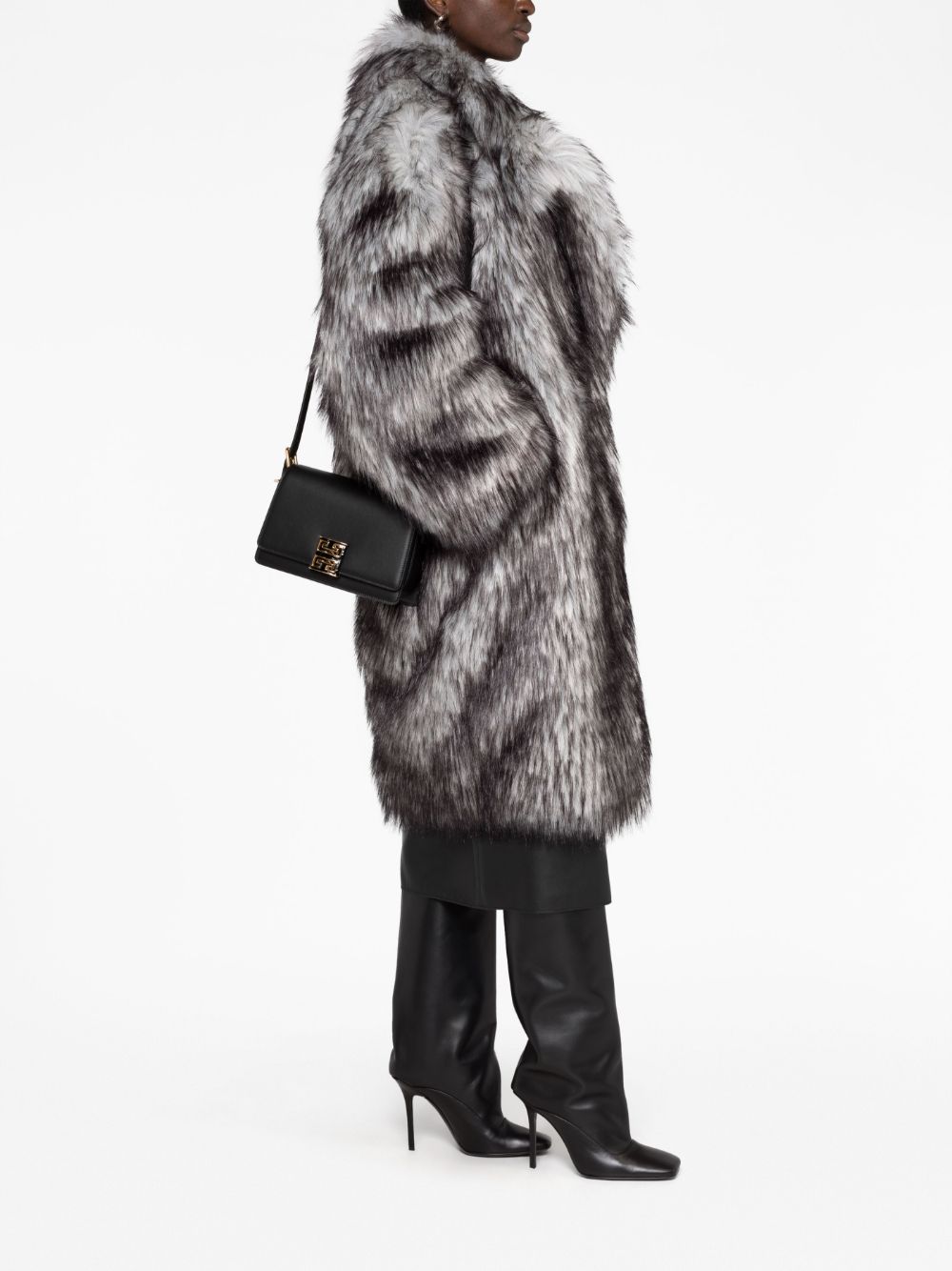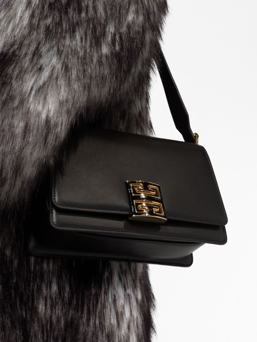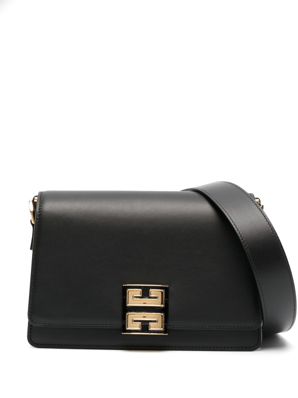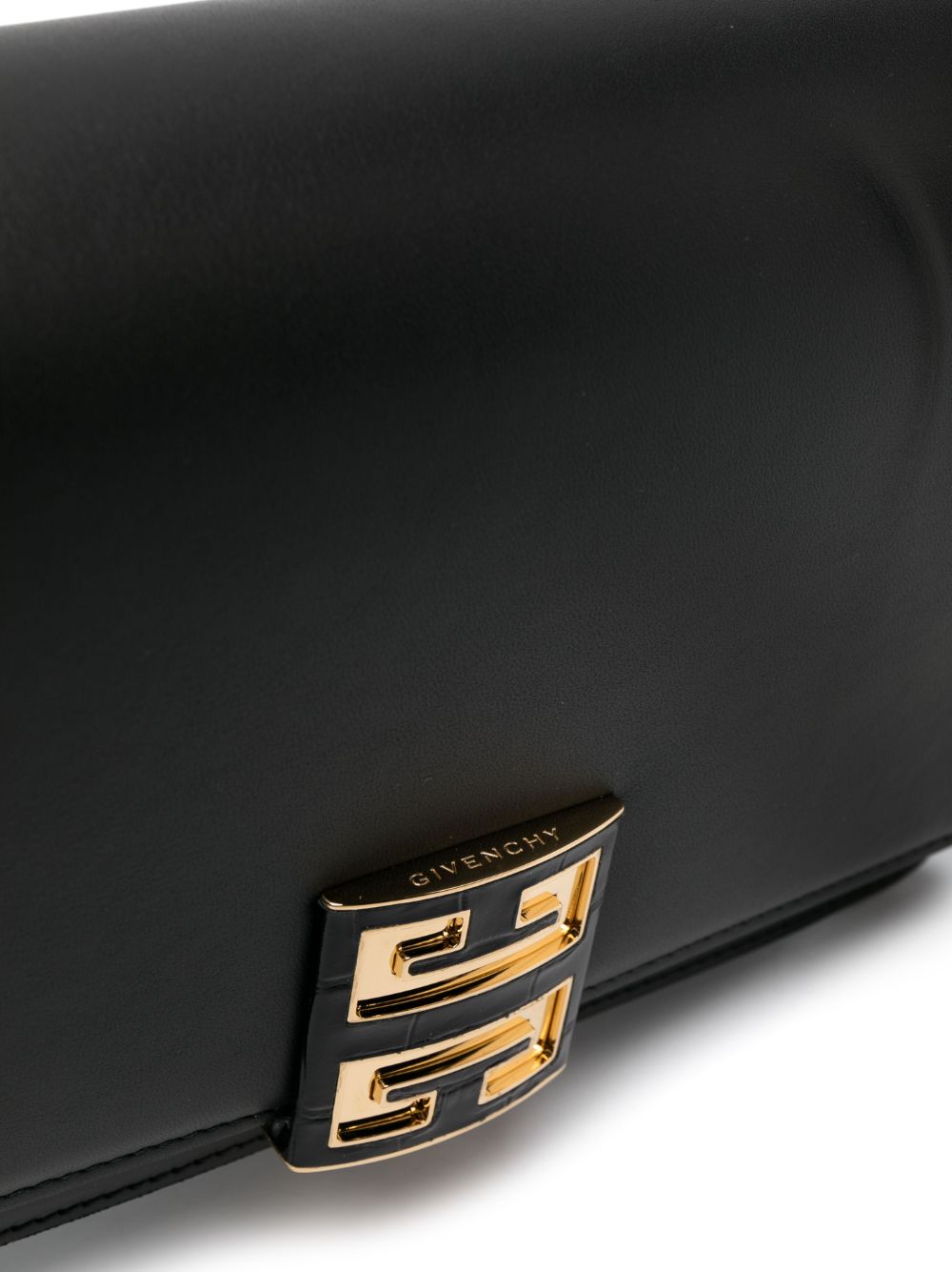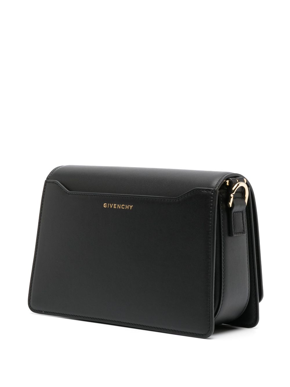 حقيبة كتف جلدية ببروش شعار الماركة من تصميم جيفنشي، يتميز هذا المنتج باللون الأسود وجلد العجل وختم الشعار على الخلف وبروش الشعار بإضاءة ذهبية وحلية معدنية بإضاءة ذهبية وخياطة ملونة وغلق علوي بالطوي وغلق مغناطيسي وحمالة كتف واحدة وأجزاء مقسمة وإبزيم داخلي.