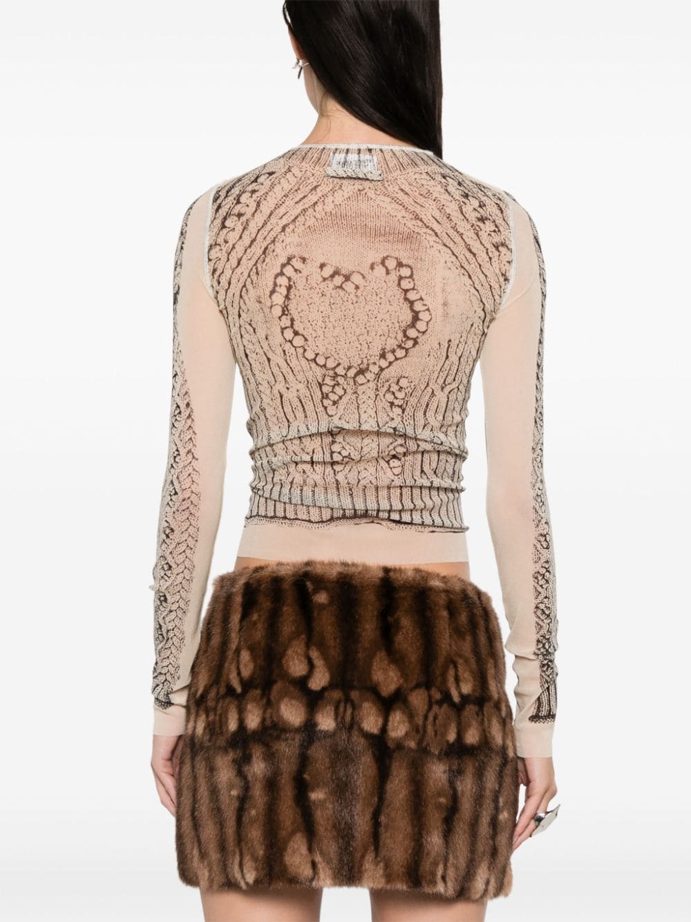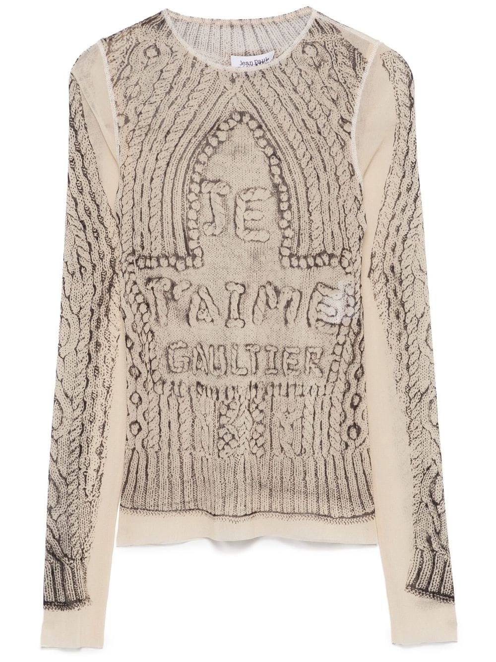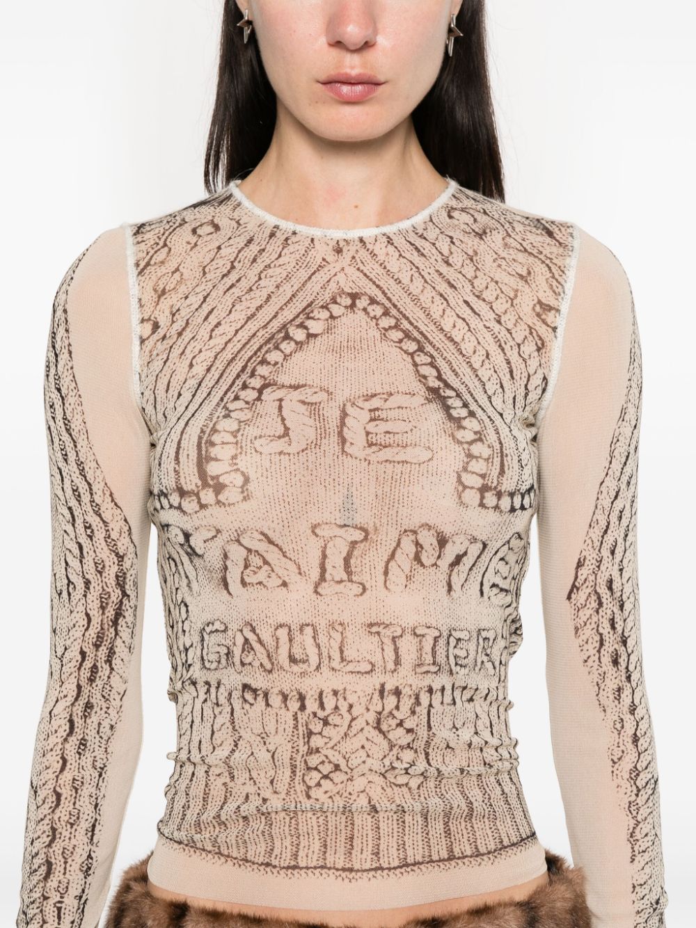 تصميم شبكي بتصميم مطاطي باللون البيج الفاتح lطباعة oeil، رقبة دائرية، وأكمام طويلة، وحاشية مستقيمة