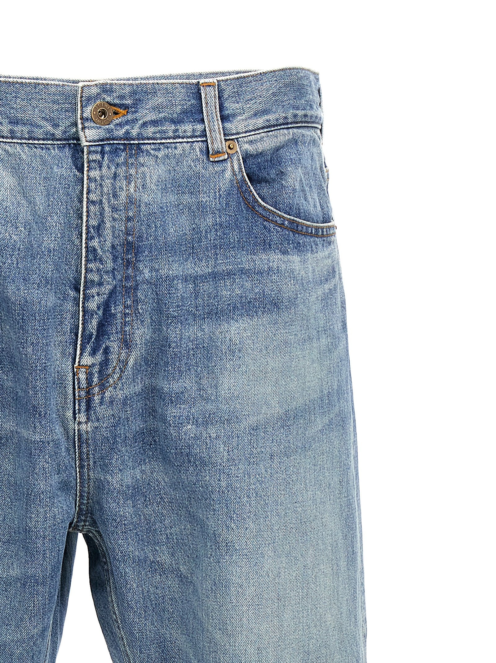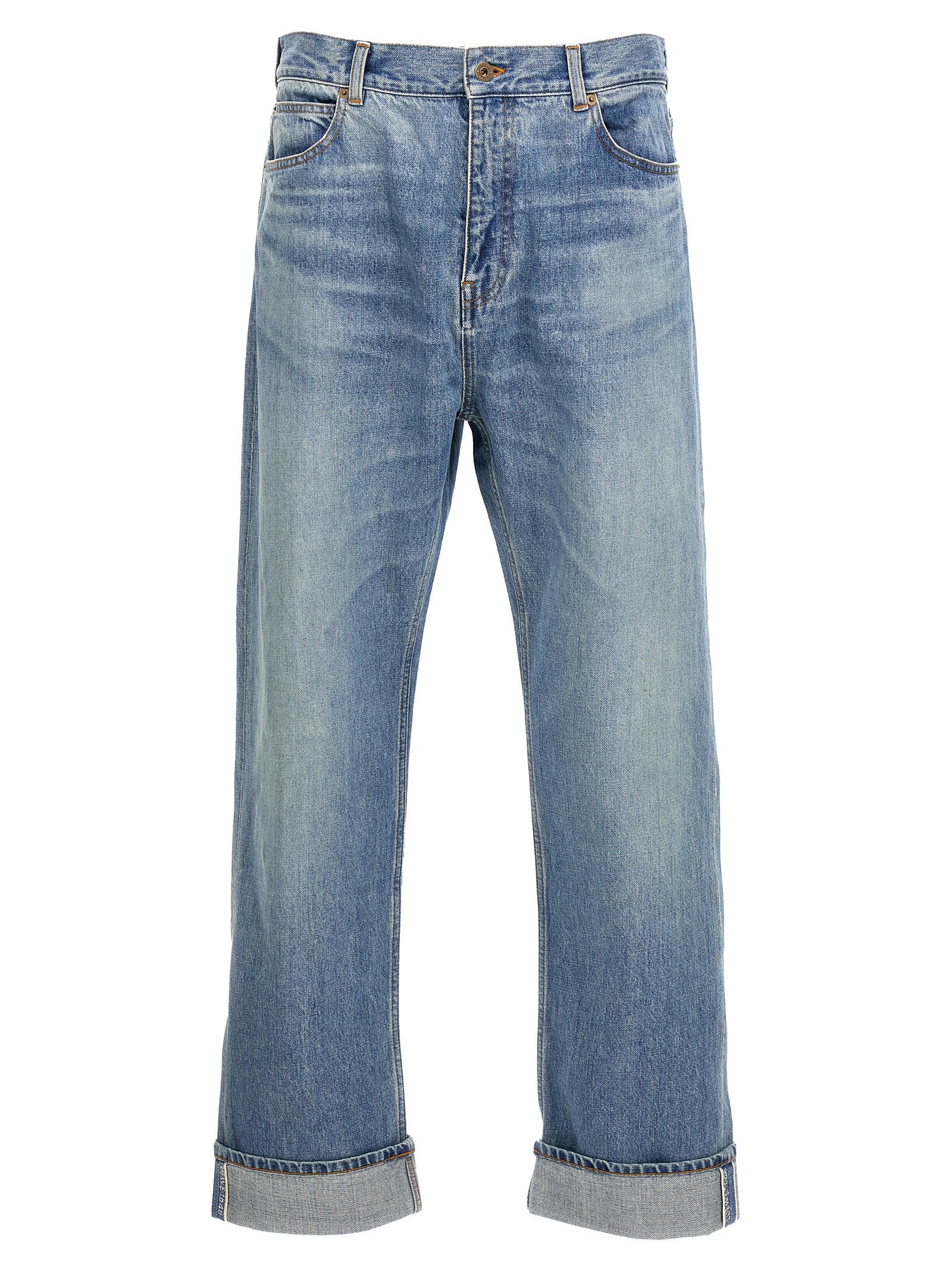 بنطال جينز من القطن "بساق مستقيمة" مزود بسحاب وزر للإغلاق، وخمسة جيوب، وعلامة الشعار الجلدية، وحاشية مطوية مع حافة.