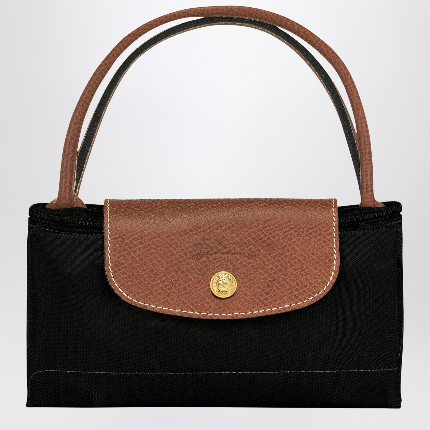 حقيبة يد صغيرة من لونشان مصنوعة من قماش البولي أميد المُعاد تدويره باللون الأسود مع تفاصيل من الجلد البني، وتتميز بمقبضين علويين، وغطاء علوي قابل للطي مع إغلاق مغناطيسي، وسحاب للإغلاق، وحجرة رئيسية.