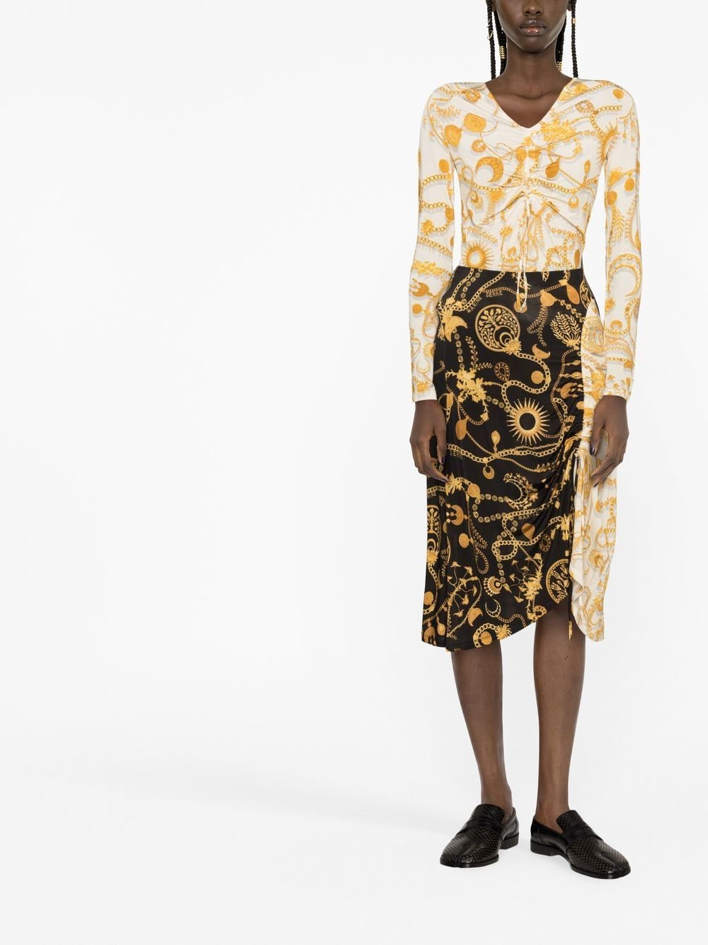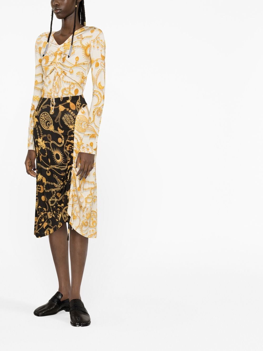 بلوزة بأكمام طويلة وطبعة قمر من تصميم MARINE SERRE، يتميز هذا المنتج بتصميم مطاطي وطبعة تصويرية كاملة وتفاصيل مدموجة ورقبة على شكل حرف V وأكمام طويلة وأطراف مستقيمة وأبيض/أصفر.