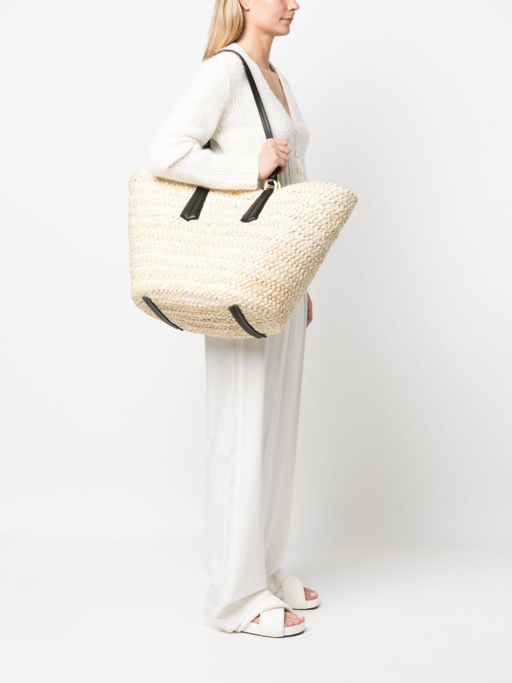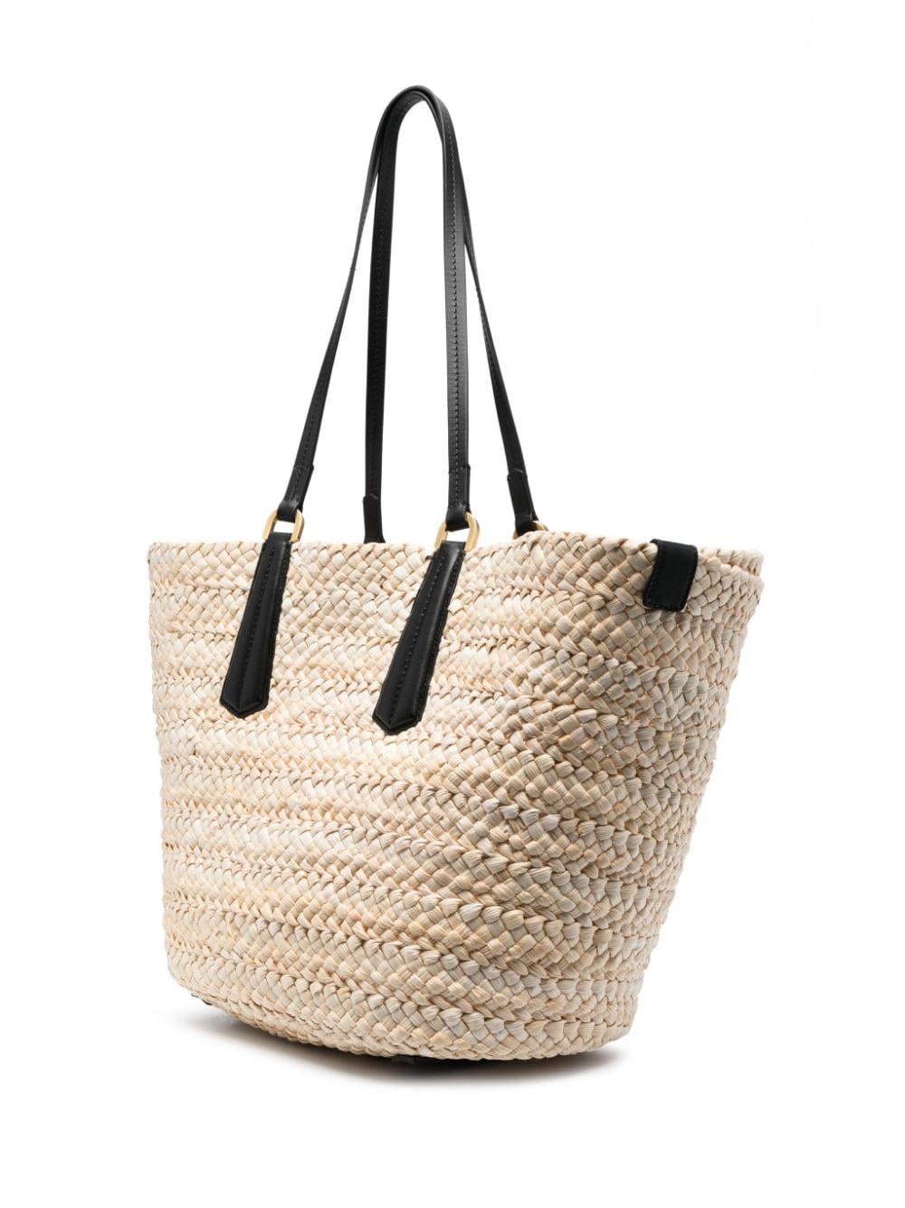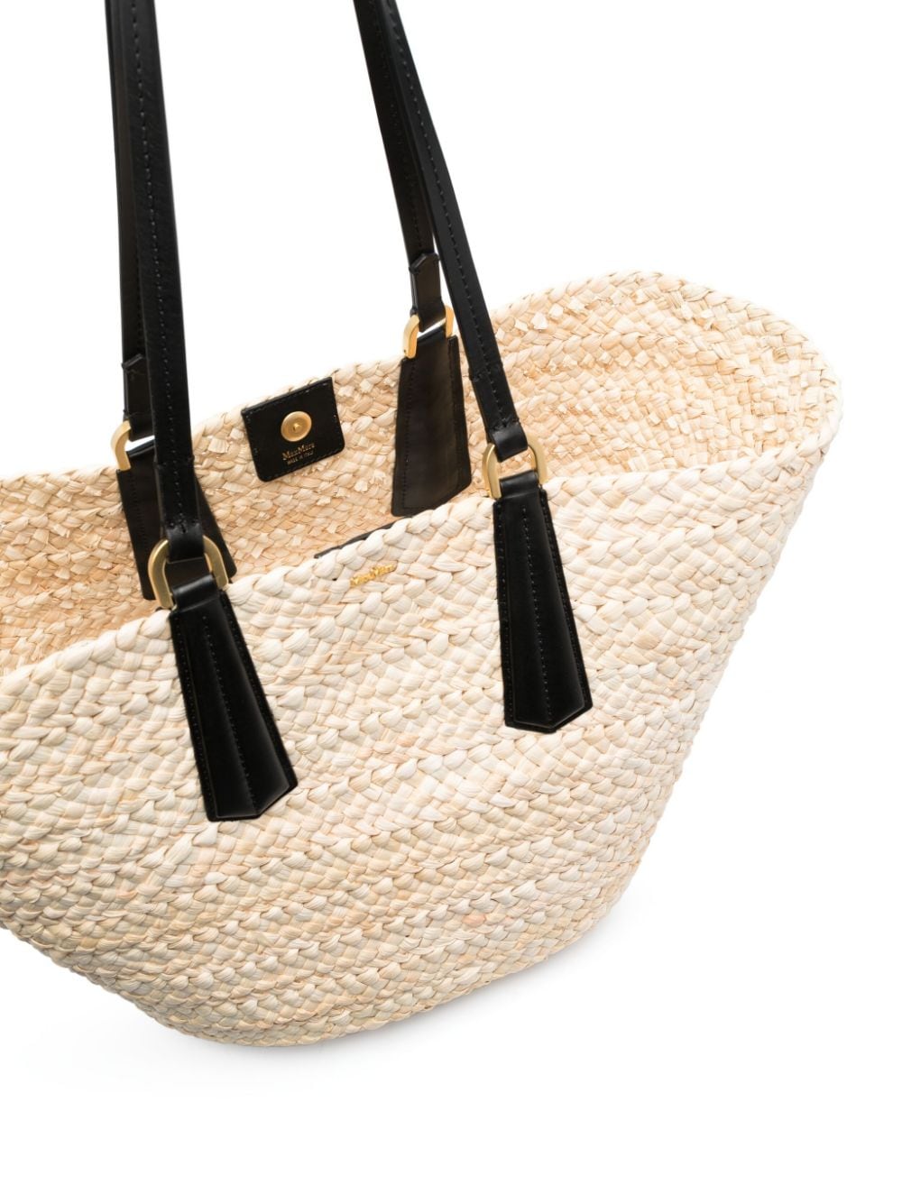 حقيبة عملية فوييجر من تصميم ماكس مارا، يتميز هذا المنتج باللون البيج الفاتح وجلد العجل وقش ومقبضين علويين وجيب داخلي بسحاب وجيب داخلي مفتوح وشعار داخلي منقوش.
