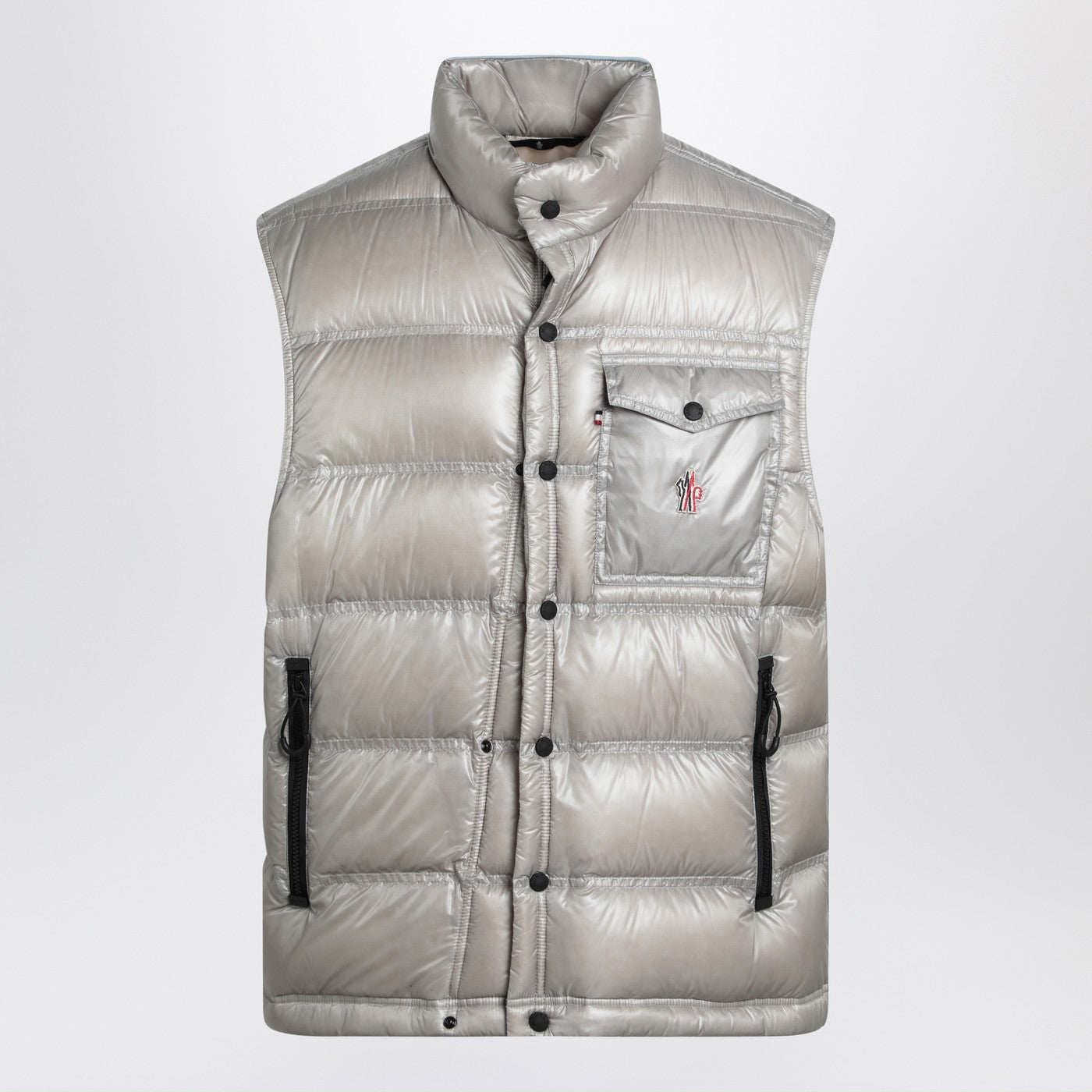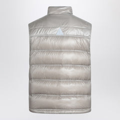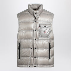 Light grey nylon padded gilet by Moncler Grenoble, featuring a zip and snap button closure, two side zip welt pockets, a chest pocket with flap and snap button, a drawstring hem, and reflective details.