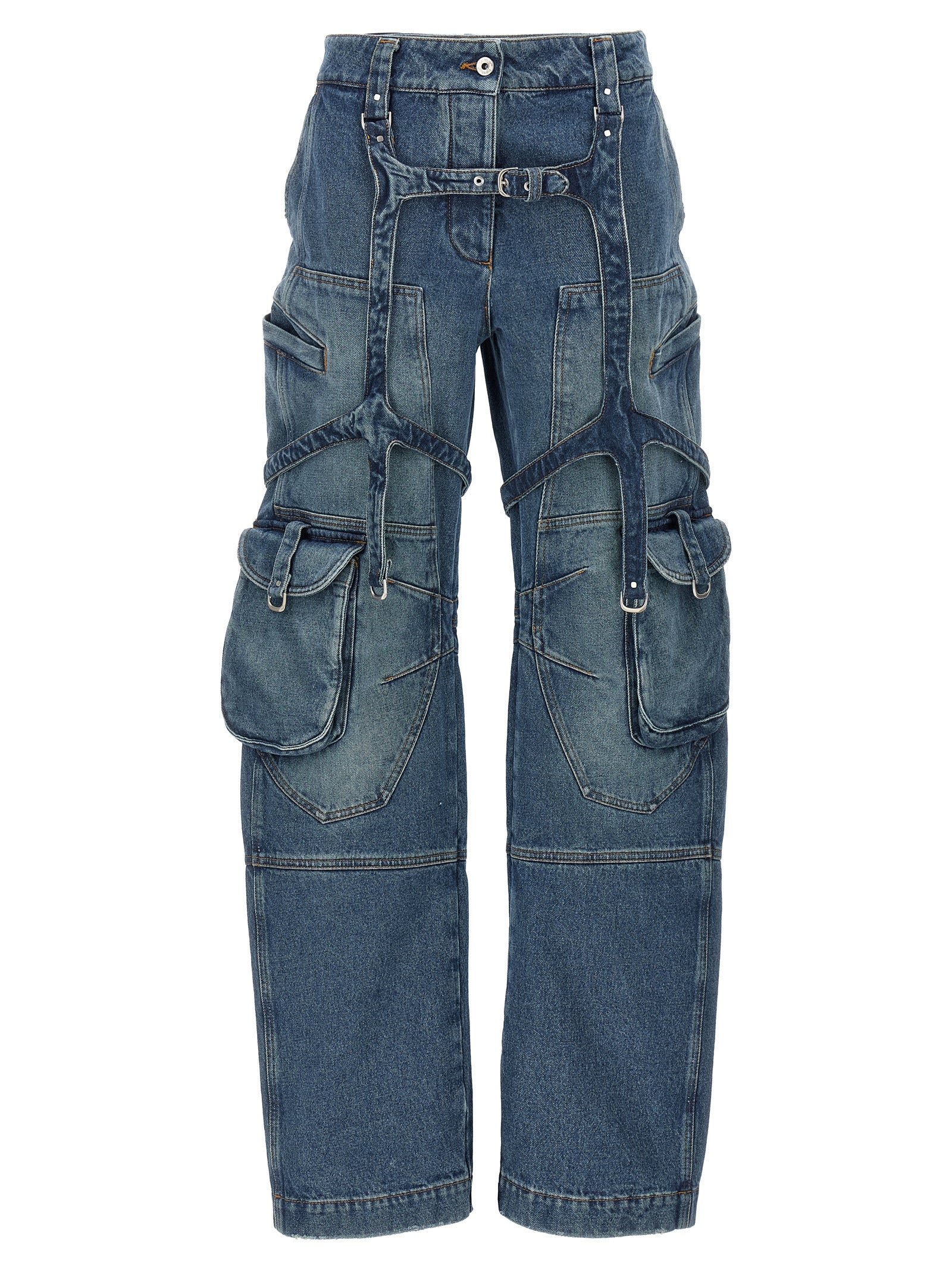 جينز "Cargo over" من قماش الدنيم القطني المغسول باللون الأزرق العتيق. ساق كبيرة الحجم تناسب تفاصيل إبزيم من نوع السرج. مزودة بجيوب، وزر للإغلاق.