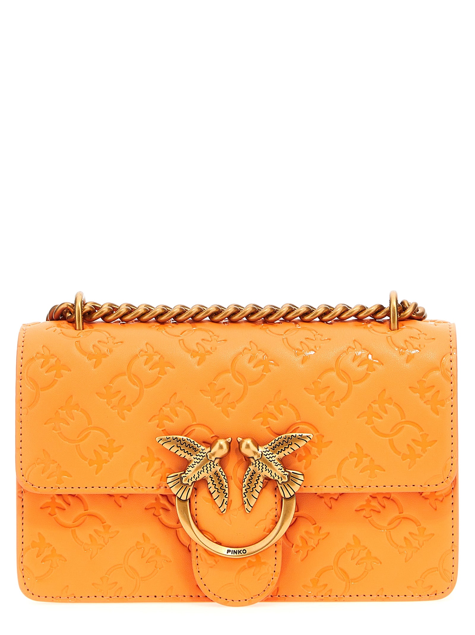 حقيبة كروس جلدية "Mini Love Bag" مع نمط شعار منقوش بالكامل، إغلاق بغطاء مغناطيسي، تطبيق شعار معدني أمامي، حزام كتف على شكل سلسلة مع حزام كتف من الجلد.
