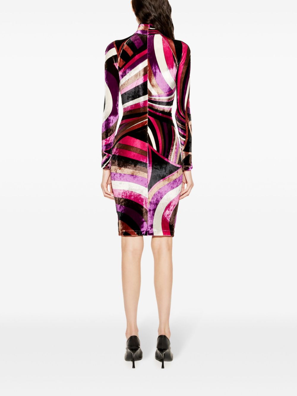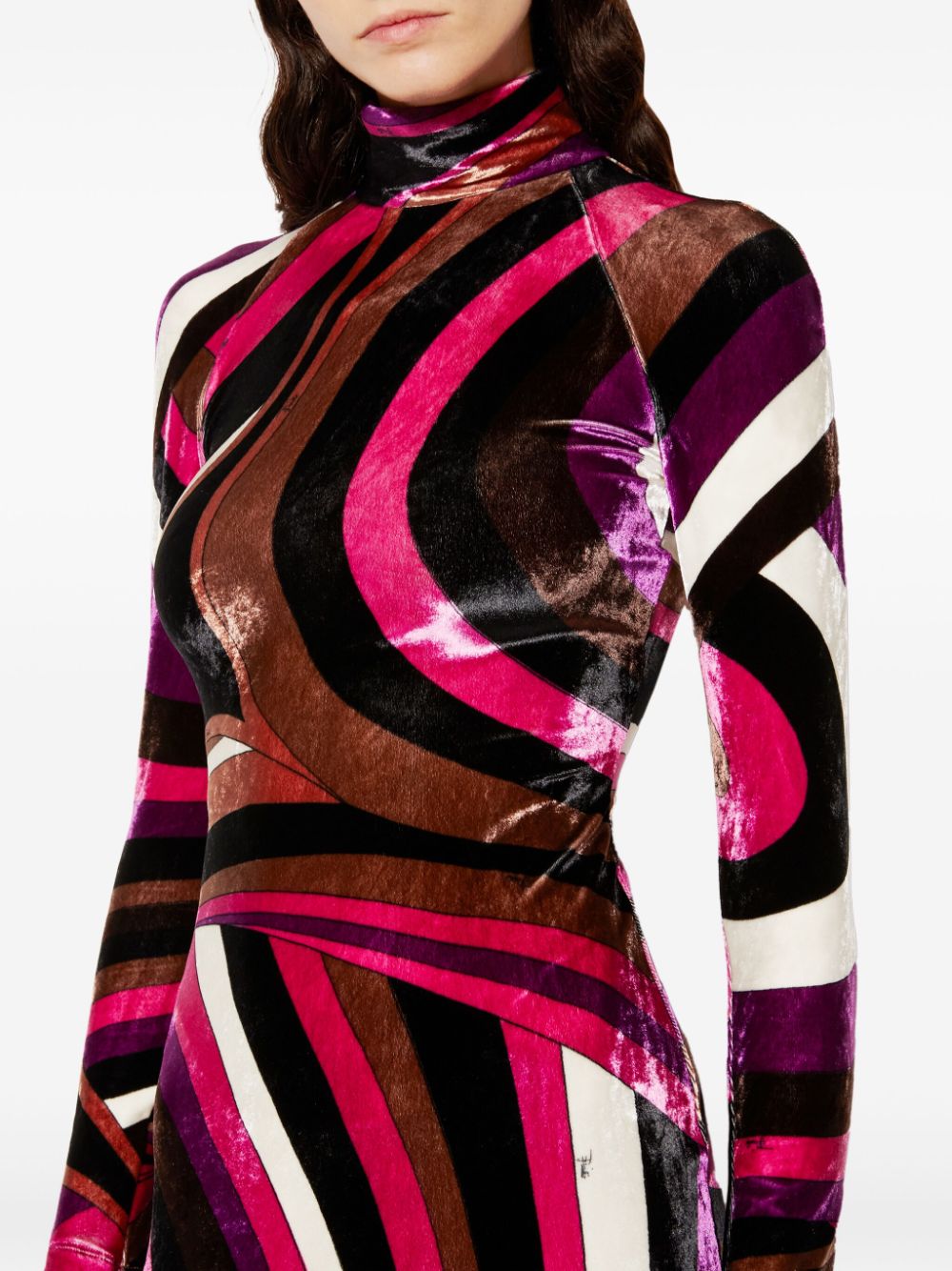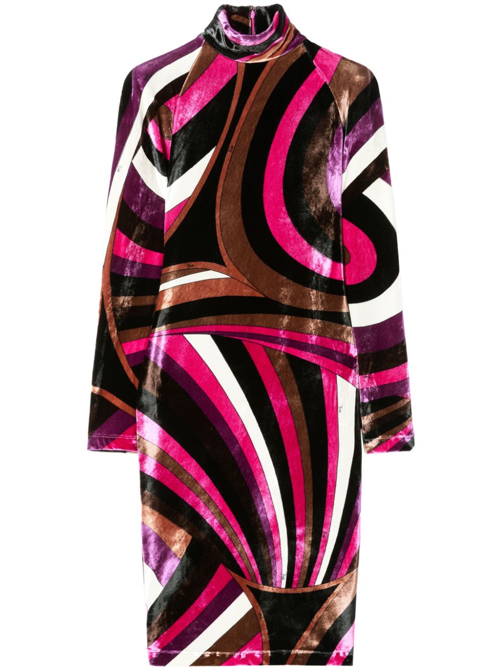 فوشيا وردي/متعدد الألوان مخملي، تصميم مطاطي، طباعة نمط تجريدي، سحاب خلفي مخفي، رقبة عالية، أكمام راجلان طويلة، حاشية مستقيمة، طول الفخذ
