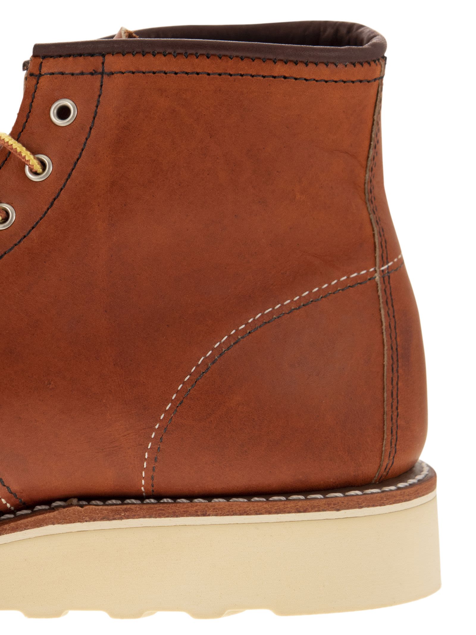 يعتبر Classic Moc مقاس 6 بوصات مرادفًا لتراث Red Wing. يشكل إصبع القدم moc الذي لا لبس فيه ونعل Traction Tred صورة ظلية تحدد المعيار الذي يتم من خلاله قياس جميع الآخرين. يستخدم جلد Gold Legacy مزيجًا من الزيوت الحصرية لـ Red Wing، مما يسمح بالحفاظ على الهيكل المحبب بالكامل دون إضافة أصباغ. - جلد - حذاء تو موك - خياطة مرئية - رقم المصمم: 3375 B ORO