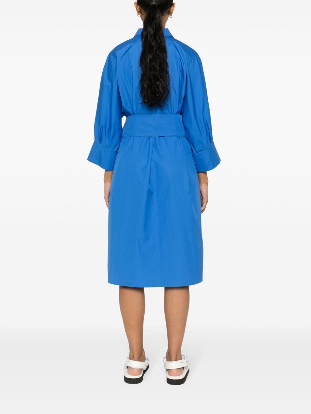 نسيج بوبلين قطني باللون الأزرق الملكي وياقة كلاسيكية وأكمام بطول ثلاثة أرباع وجيبين جانبيين وتفاصيل مربعة وطيات وعلامة شعار داخلية وحاشية مستقيمة متوسطة الطول وزر أمامي مخفي