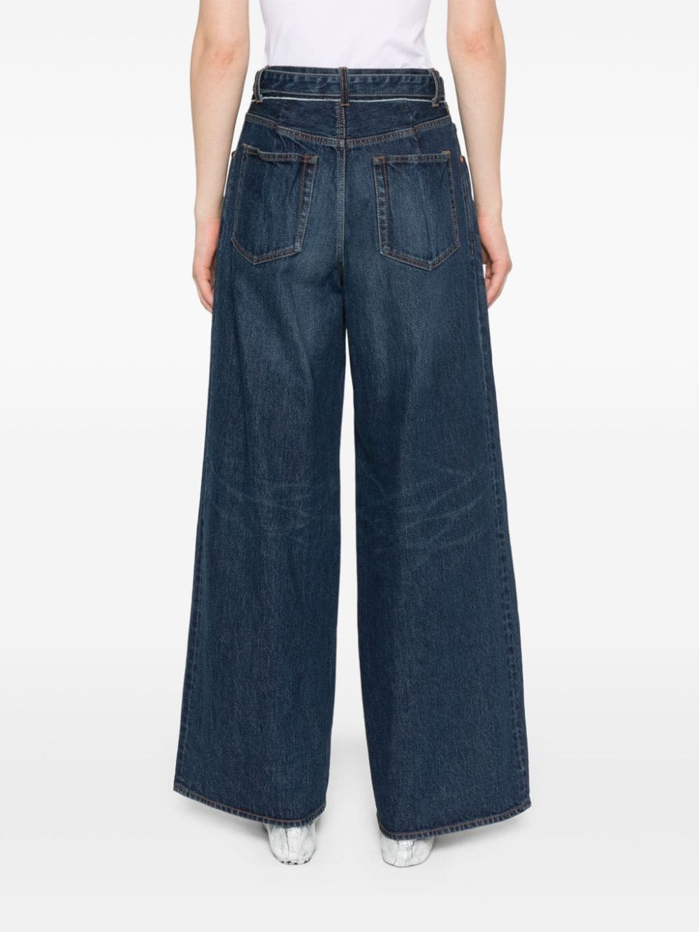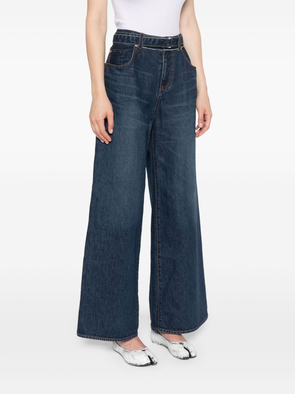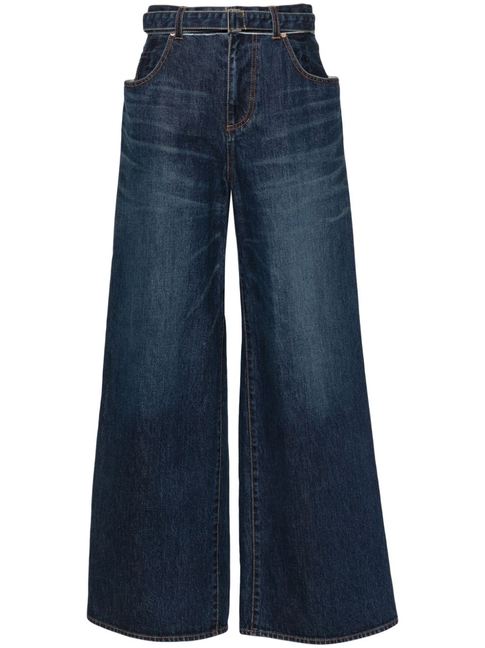 navy blue cotton denim detachable waist belt high-rise belt loops front button and zip fastening wide leg classic five pockets straight hem