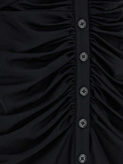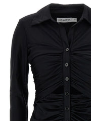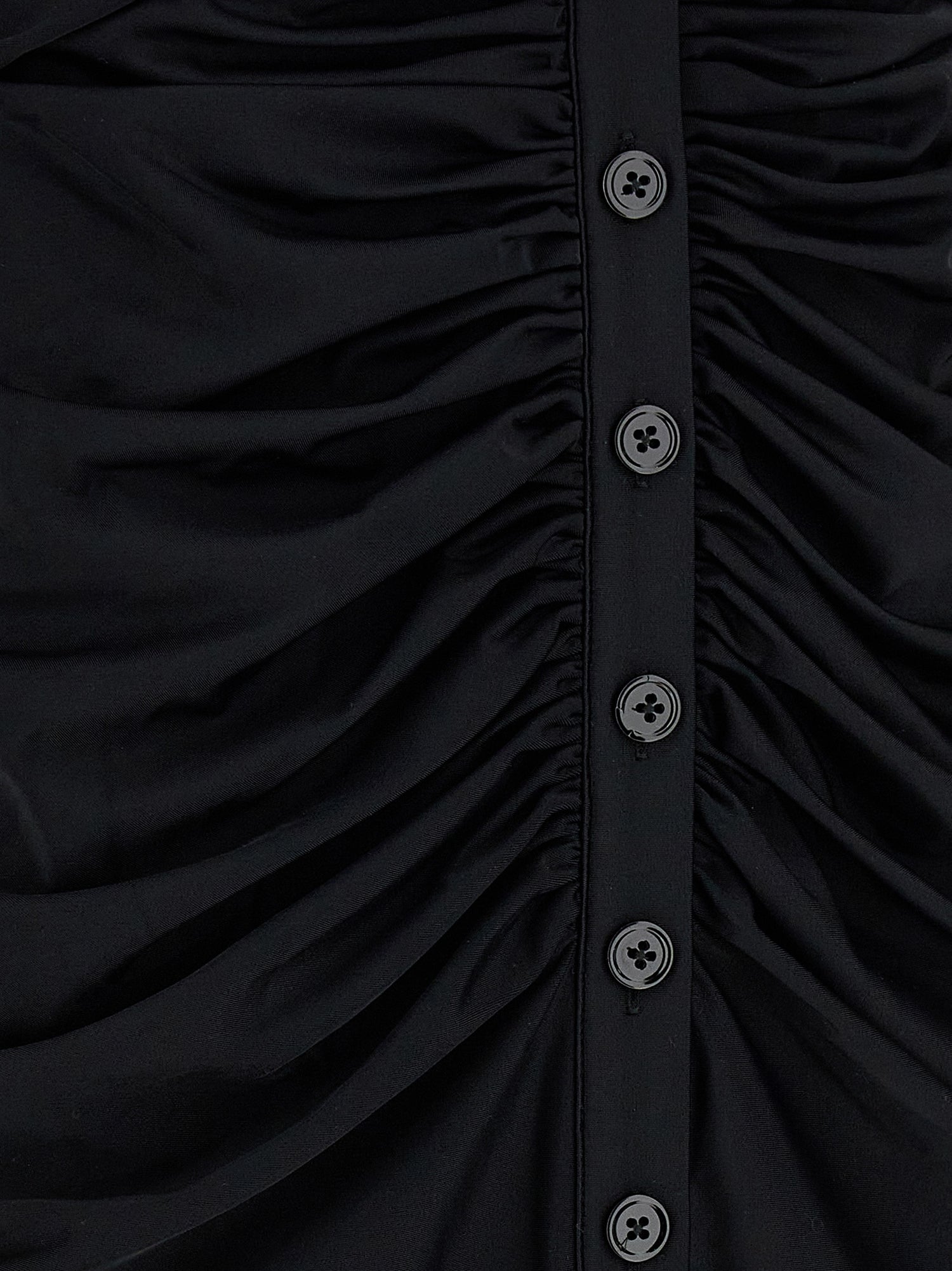 "القميص الأسود قطع" فستان ميدي "في قميص امتداد مع تجعيد الشعر وتفاصيل القطع الأمامية ، ذوي الياقات البيضاء ، إغلاق الأزرار ، الأكمام الطويلة.