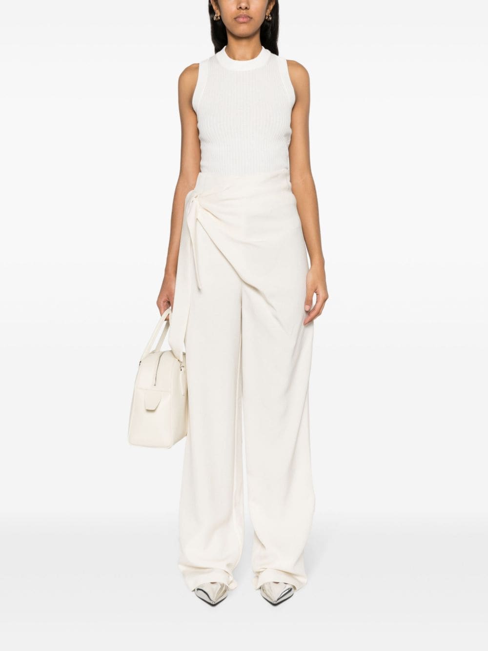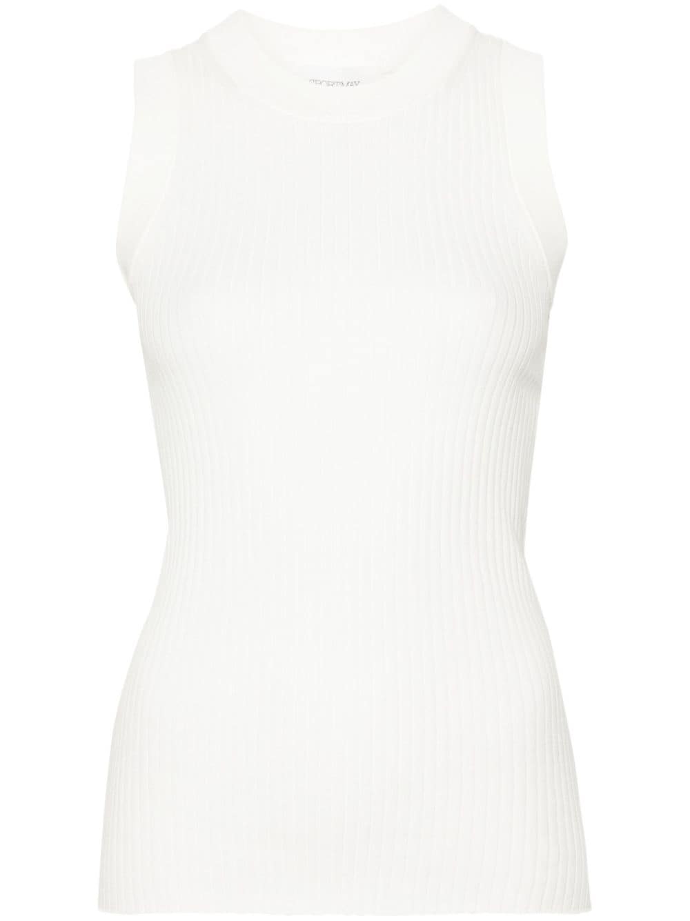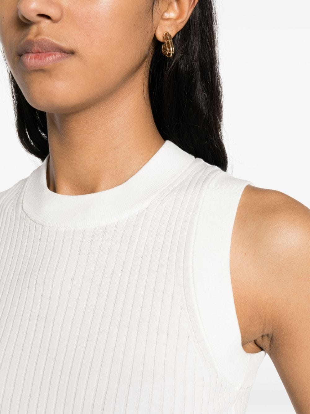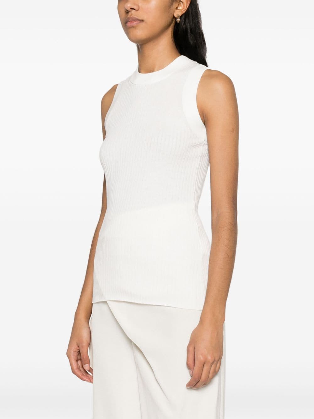 تصميم محبوك من القطن الأبيض، رقبة دائرية مضلعة بدون أكمام، حاشية مستقيمة بظهر متسابق