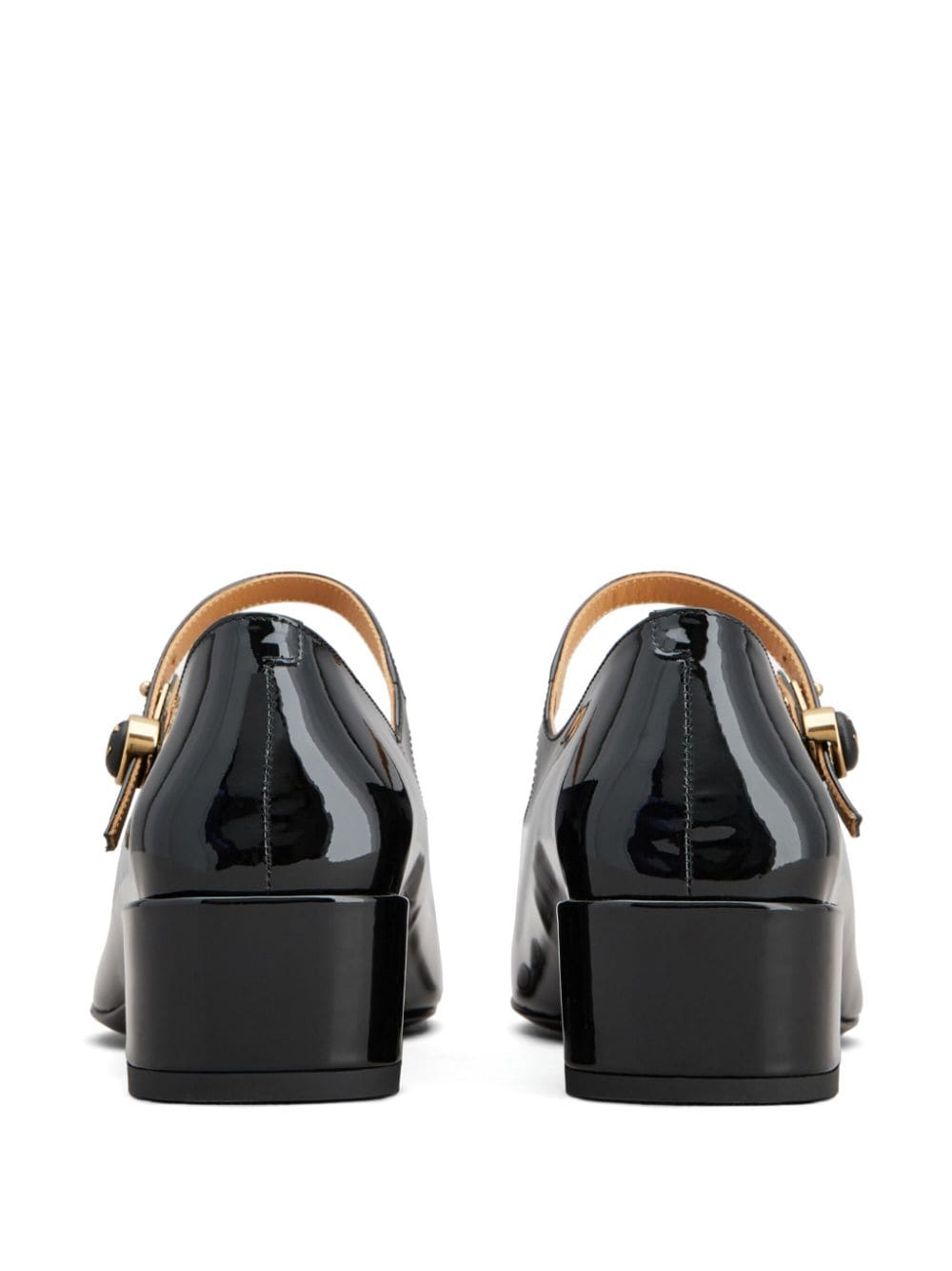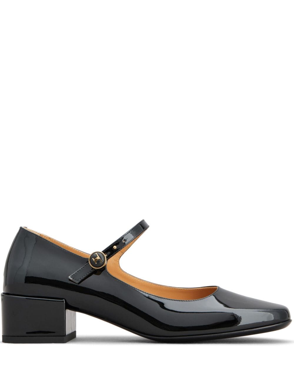 جلد عجل أسود داكن، لمسة نهائية لامعة، أجزاء معدنية ذهبية اللون، أزرار منقوشة بالشعار، مقدمة لوزية، إبزيم بزر جانبي، نعل داخلي من الجلد ذو علامة تجارية، كعب كتلة، نعل جلدي
