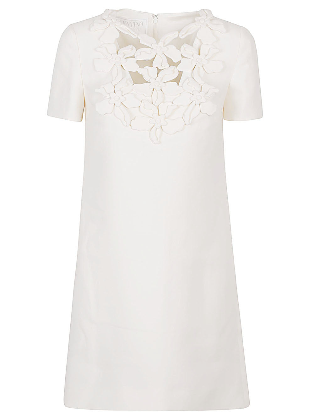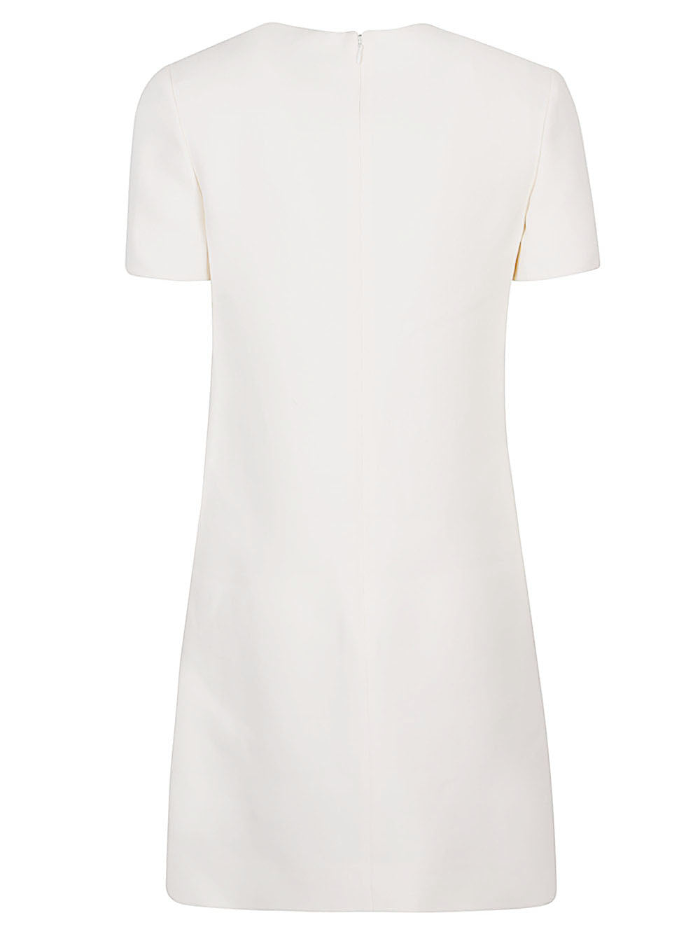 فستان قصير مطرز، إغلاق بسحاب خلفي، أكمام قصيرة، أطراف مستقيمة.