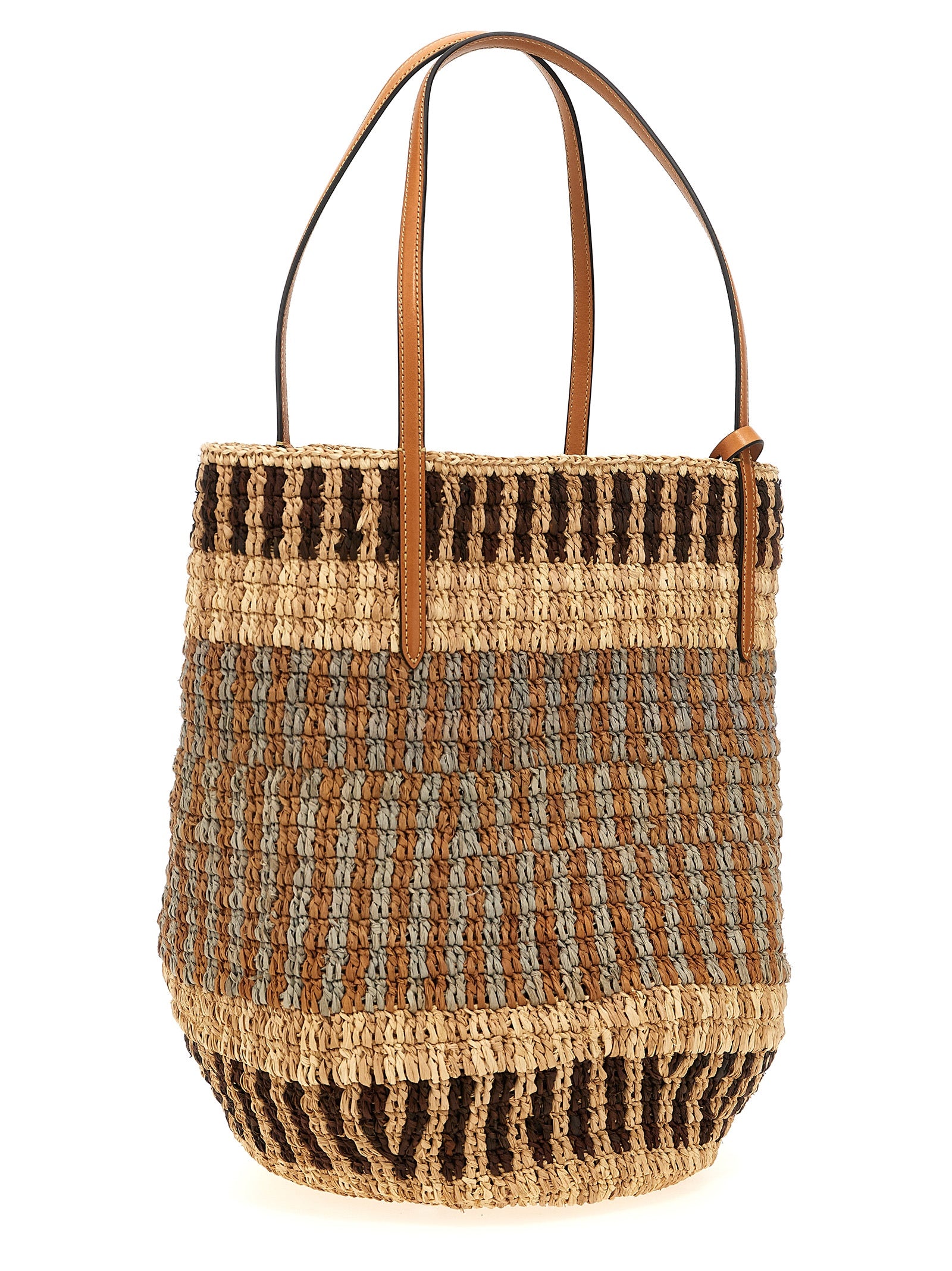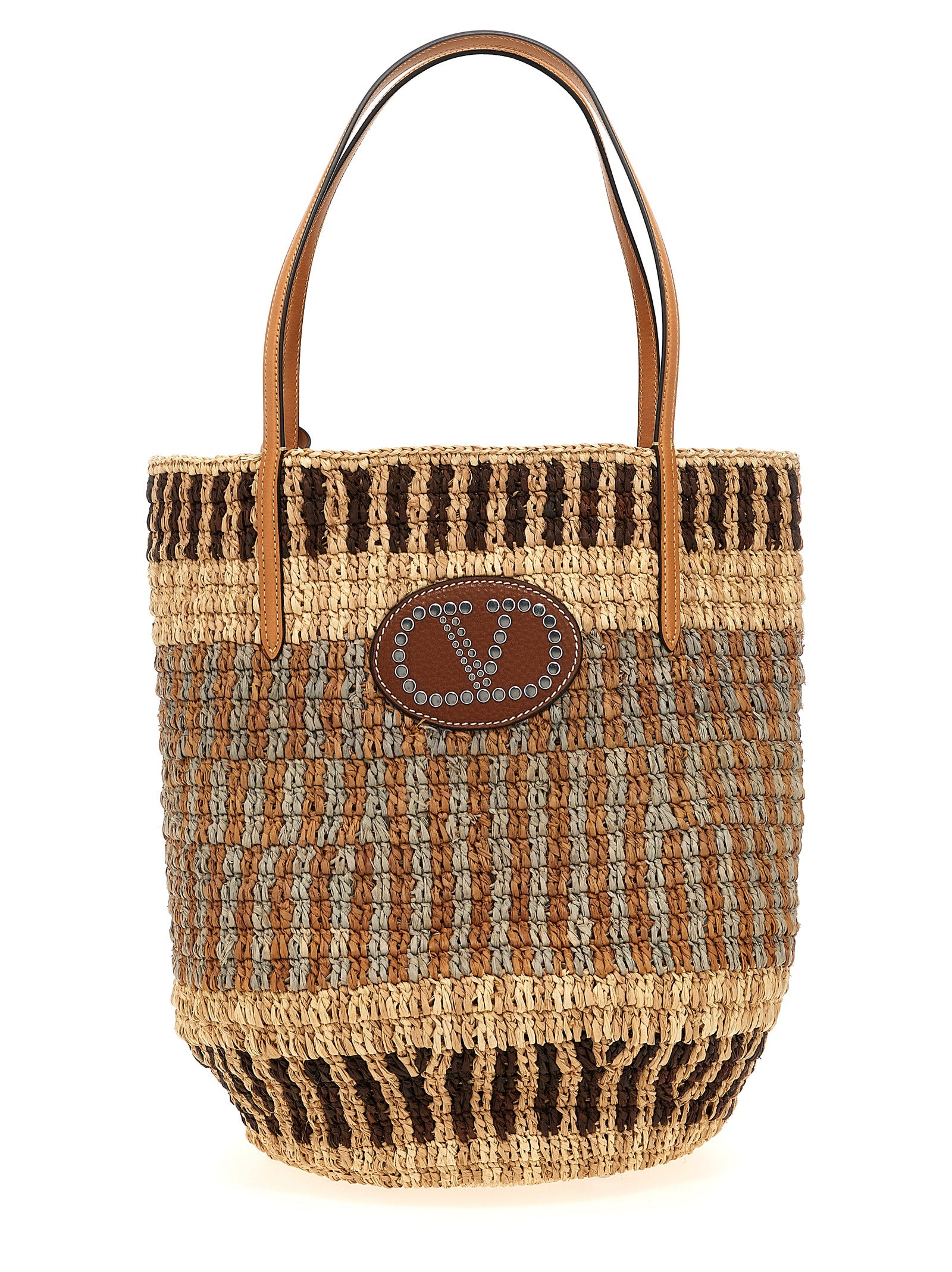 متسوق رافيا منسوج يدويًا، رقعة جلدية مرصعة من Vlogo Signature، مقبض جلدي ثابت مزدوج، تفاصيل معدنية، حقيبة يد جلدية قابلة للإزالة.
