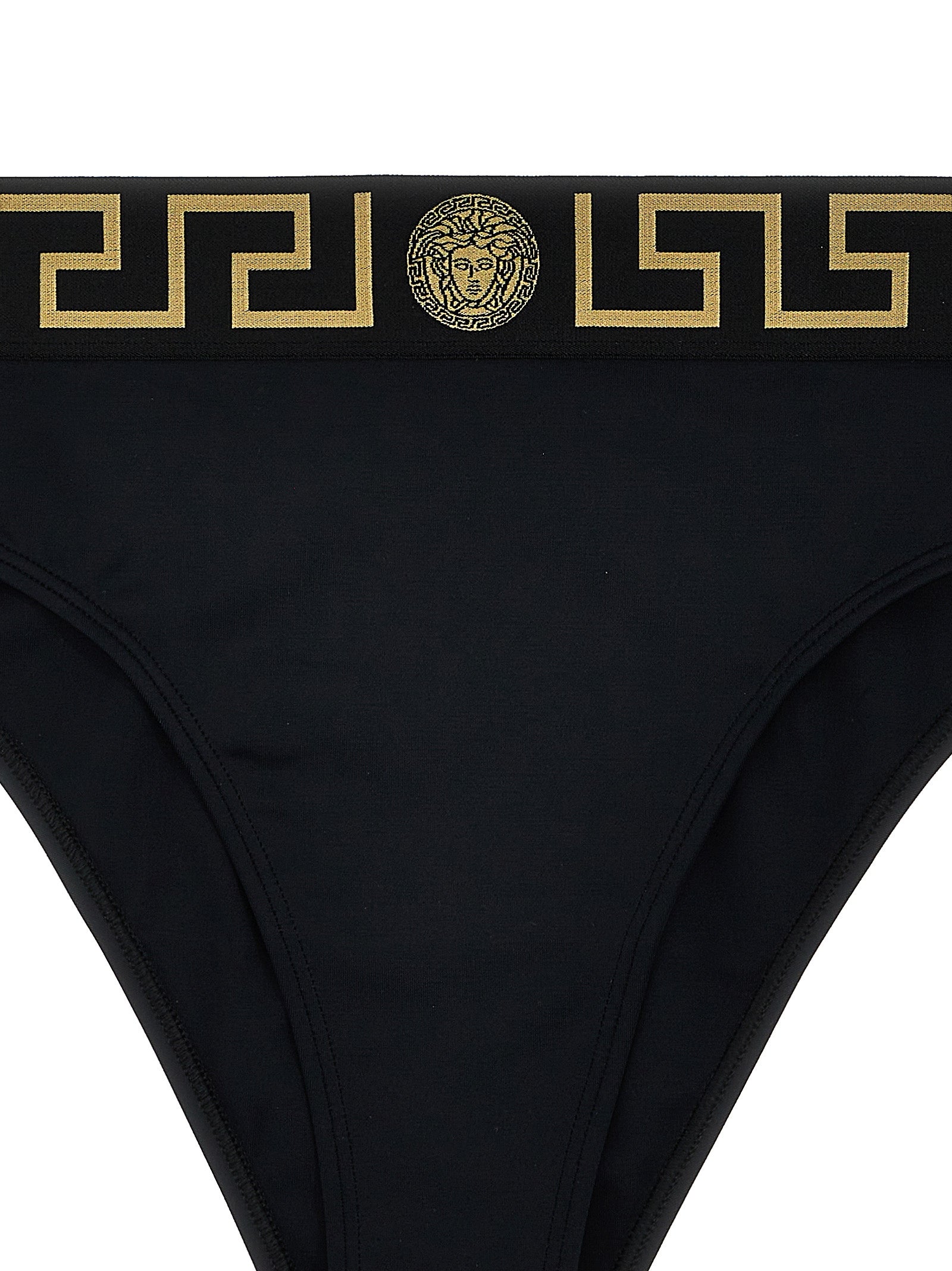 قطعة بيكيني سفلية من القماش المطاطي مع حزام خصر مرن بنمط "Greca"، موديل بخصر عالٍ.