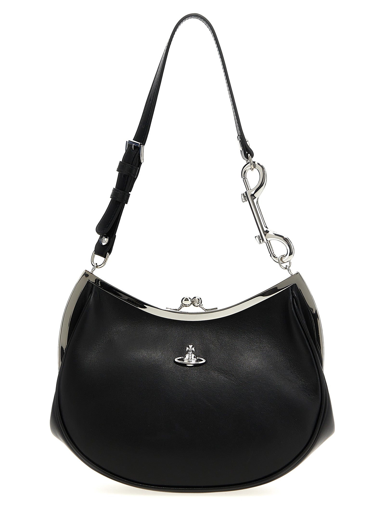 حقيبة الكتف الجلدية "سحر إطار" مع تفاصيل معدنية ، شعار الجرم السماوي المعدني المنقوش في المقدمة ، الإغلاق المفاجئ ، مقبض قابل للتعديل.