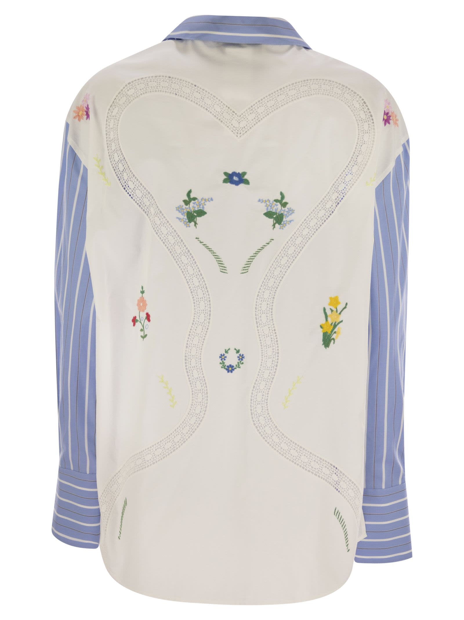 قميص فضفاضة مصنوعة من بوبلين القطن النقي مع ذوي الياقات البيضاء والرقابة في المقدمة ، والأكمام الطويلة مع الأصفاد العالية وربط الأزرار. تم تزيين هذا النموذج مع إدراج متناقض على الظهر مع تطريز الأزهار وتفاصيل Macramé Lace-Effecterie. انتهى مع جيب الثدي المقطوع والشقوق الجانبية. - تثبيت الزر الأمامي - إدراج متناقض على الخلفية - جيب الثدي - معرف مصمم نمط مخطط: 2515111022600 059