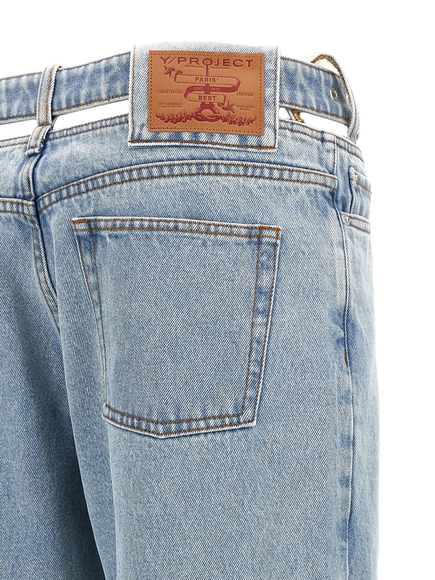 بنطال جينز من القطن "Evergreen Y Belt" مزود بسحاب وزر للإغلاق، وخمسة جيوب، وعلامة شعار جلدية، وتفاصيل مقصوصة وحزام بإبزيم شعار على الخصر.