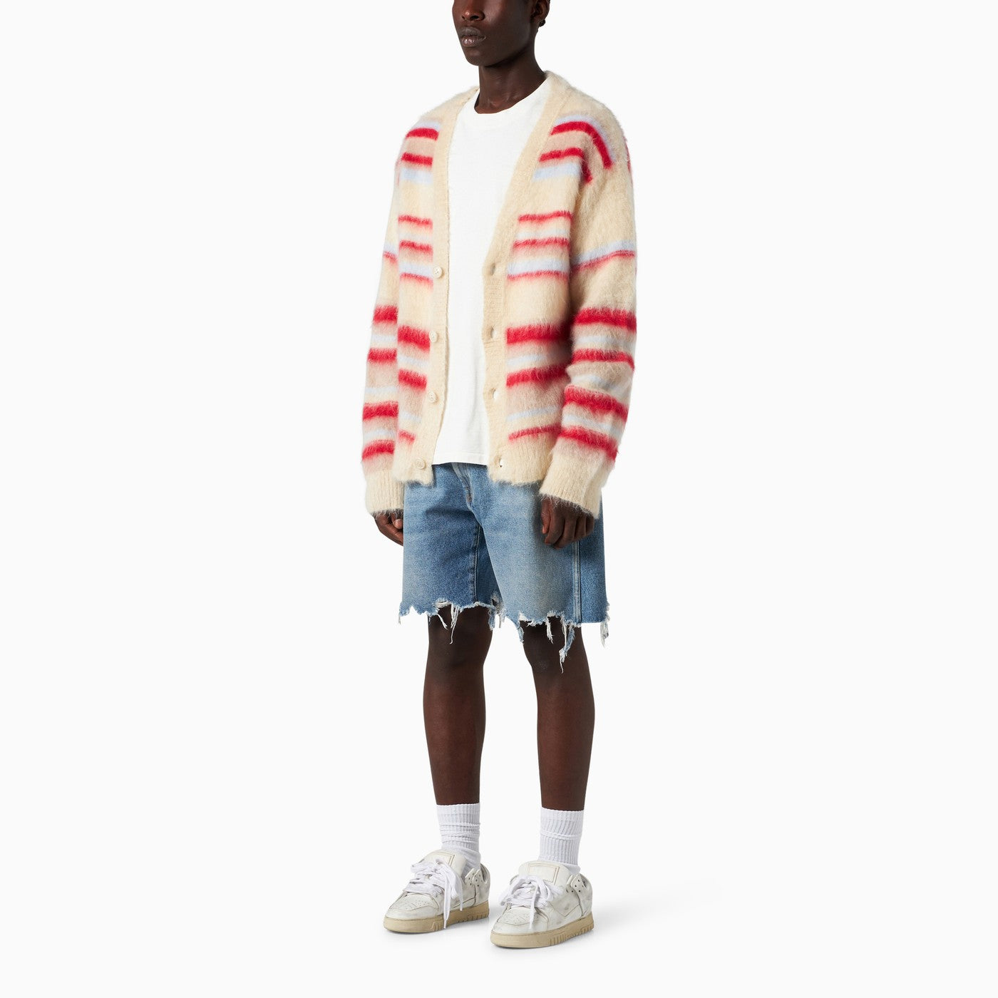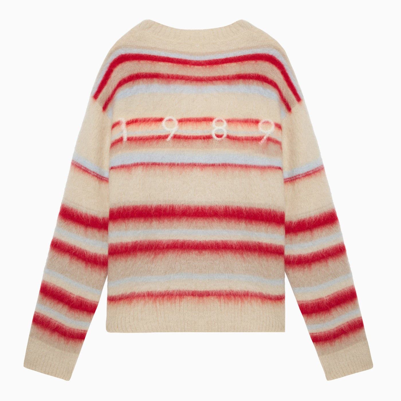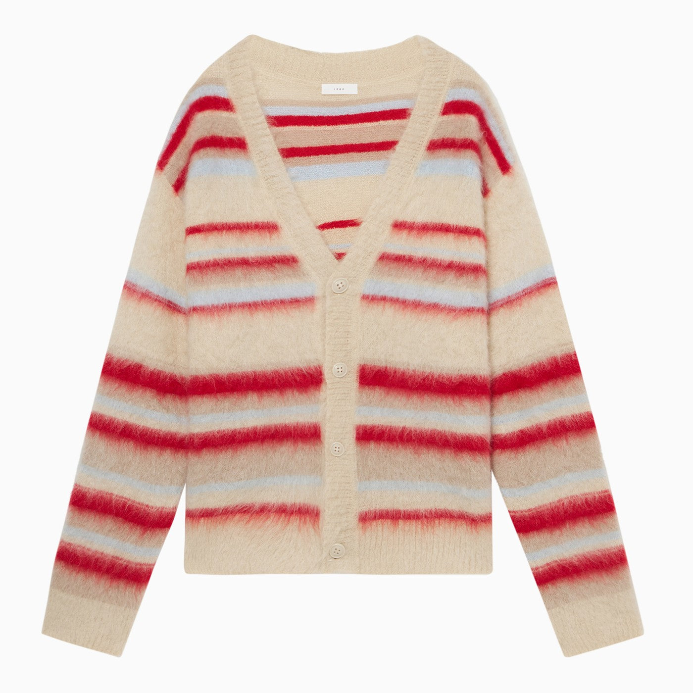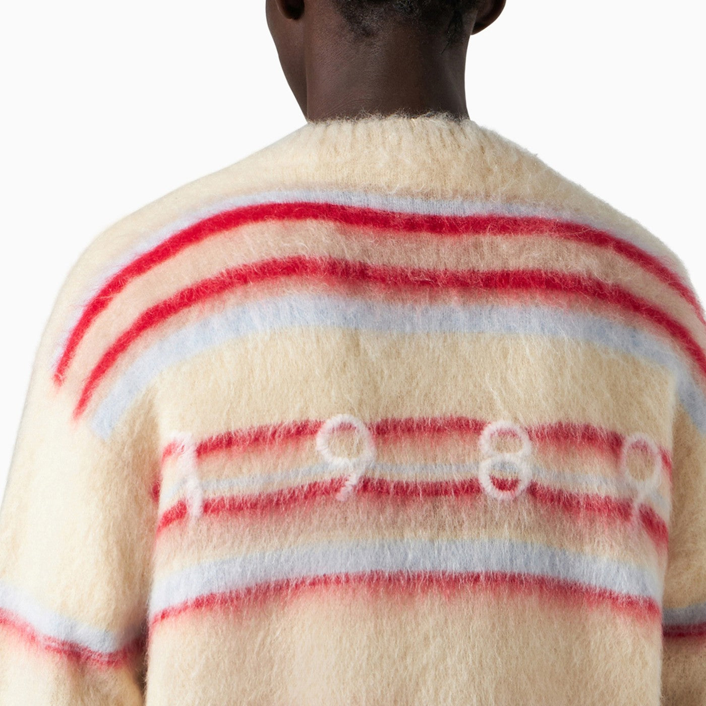Striped cardigan by 1989 Studio in a merino wool blend with V neck, front placket, and logo at back.