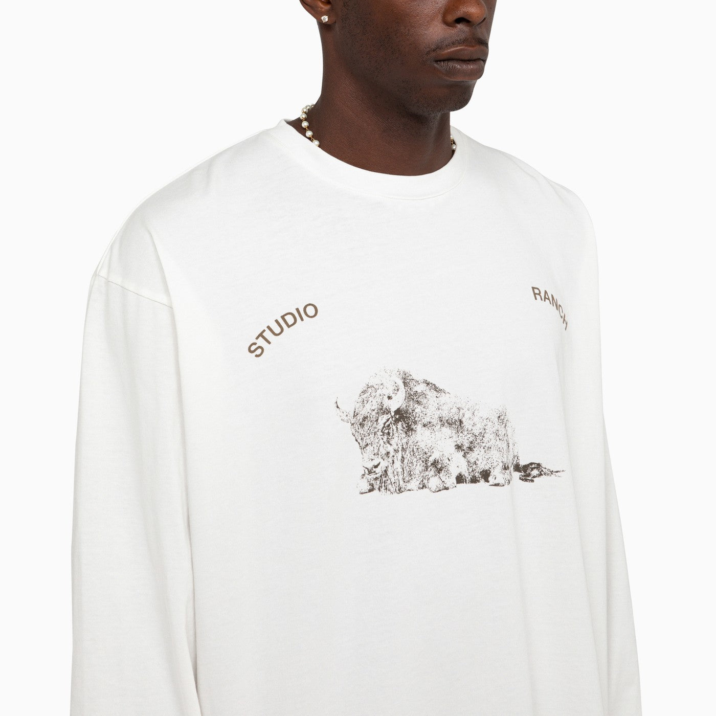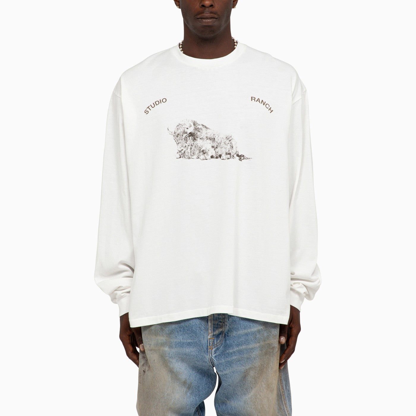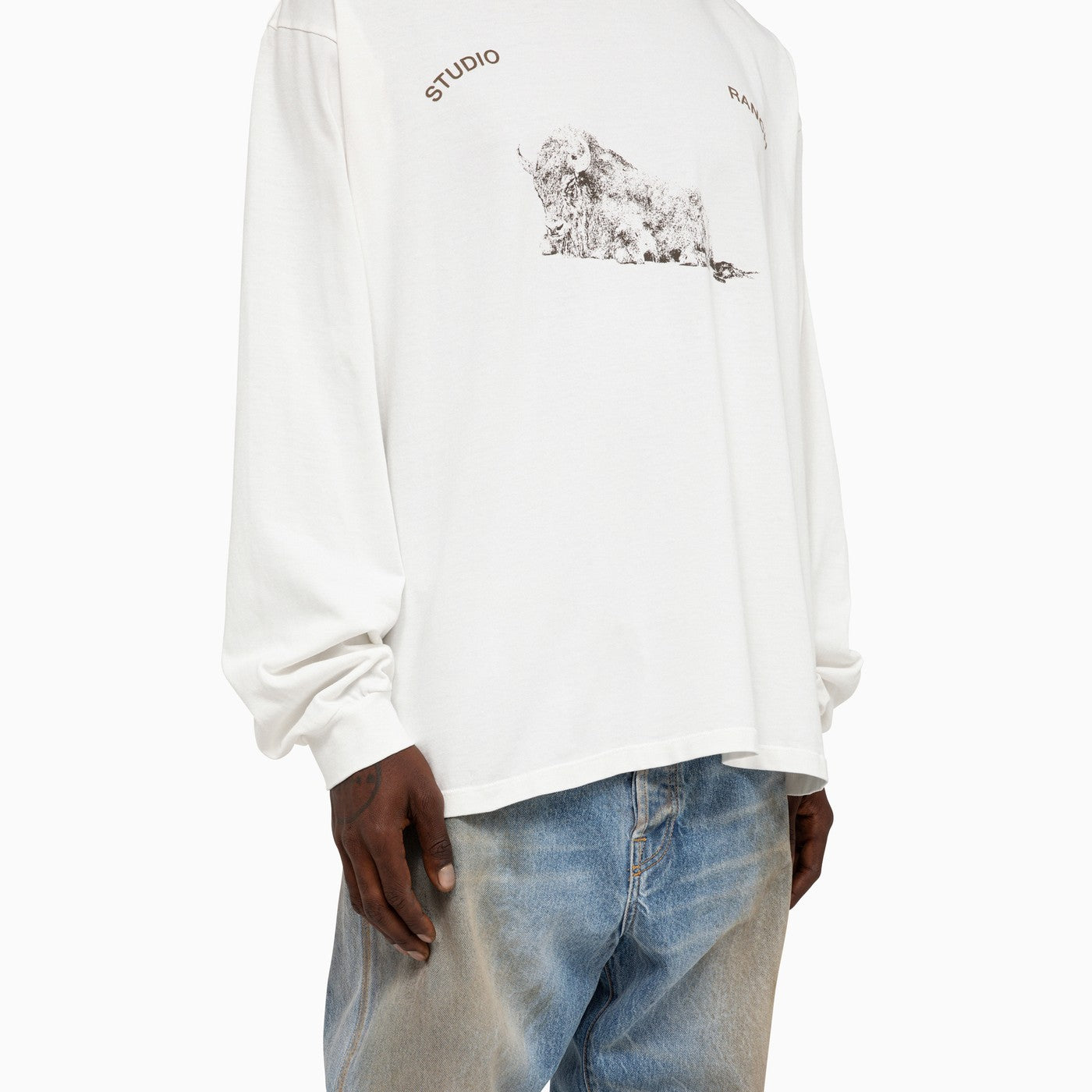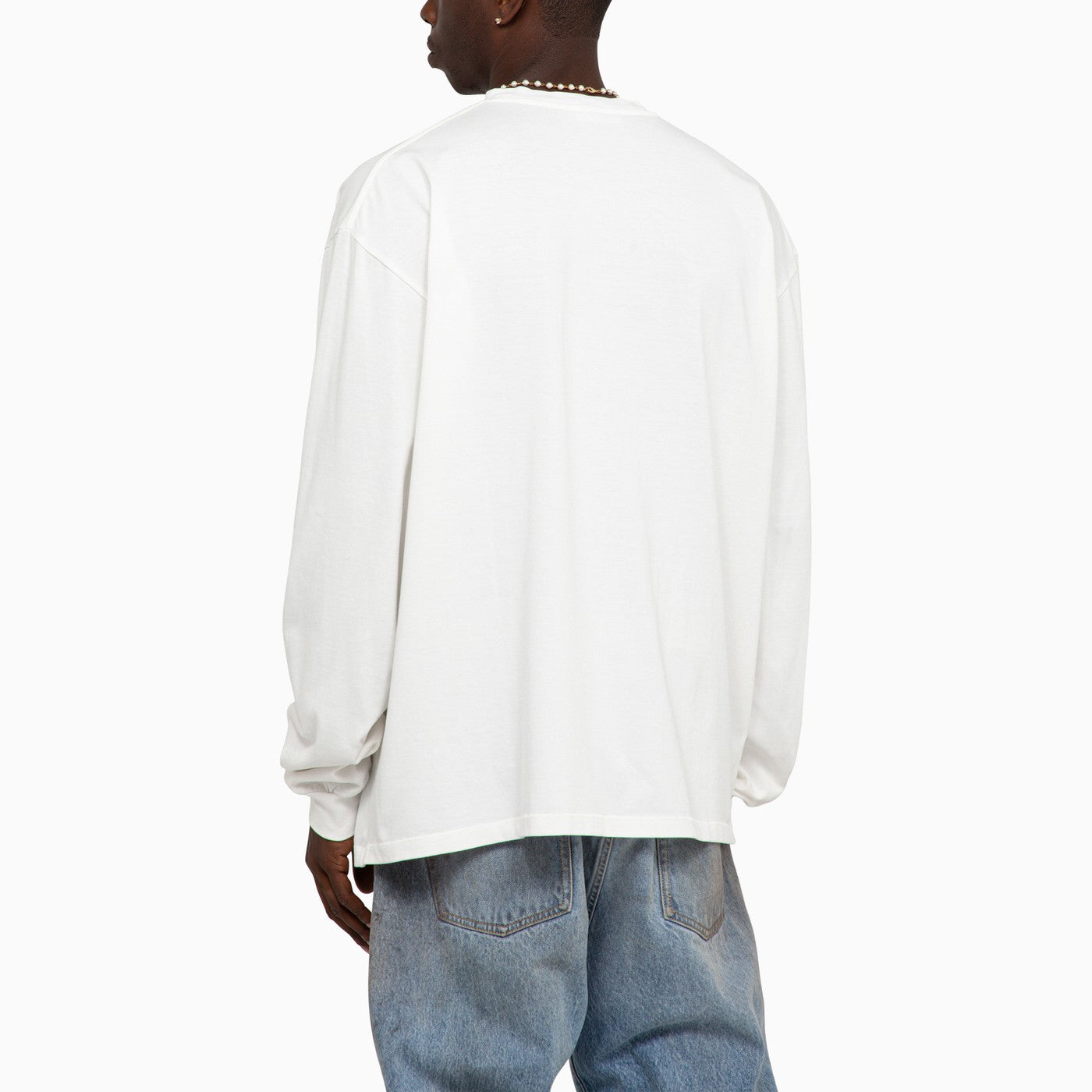 White cotton jersey long sleeved t-shirt by 1989 Studio featuring graphic printed artwork at front and blind hem stitching throughout. Relaxed fit.