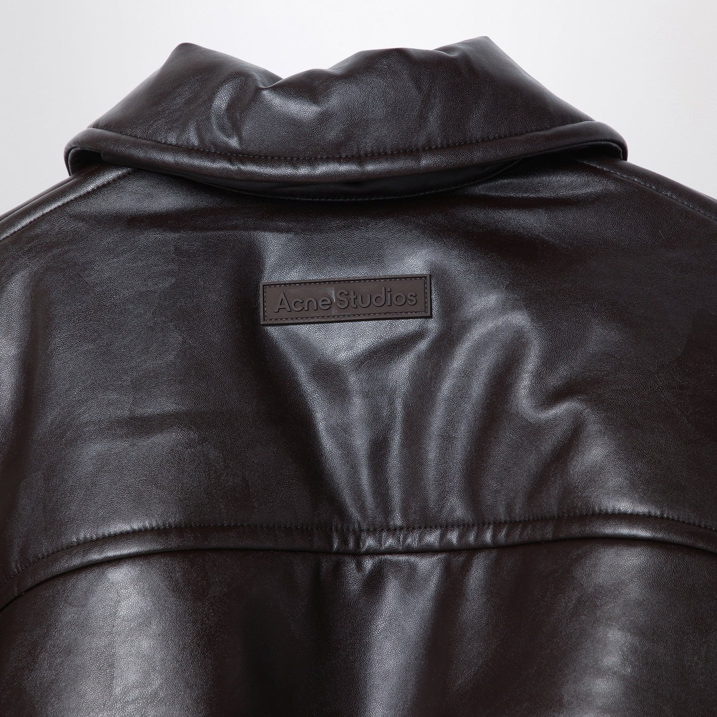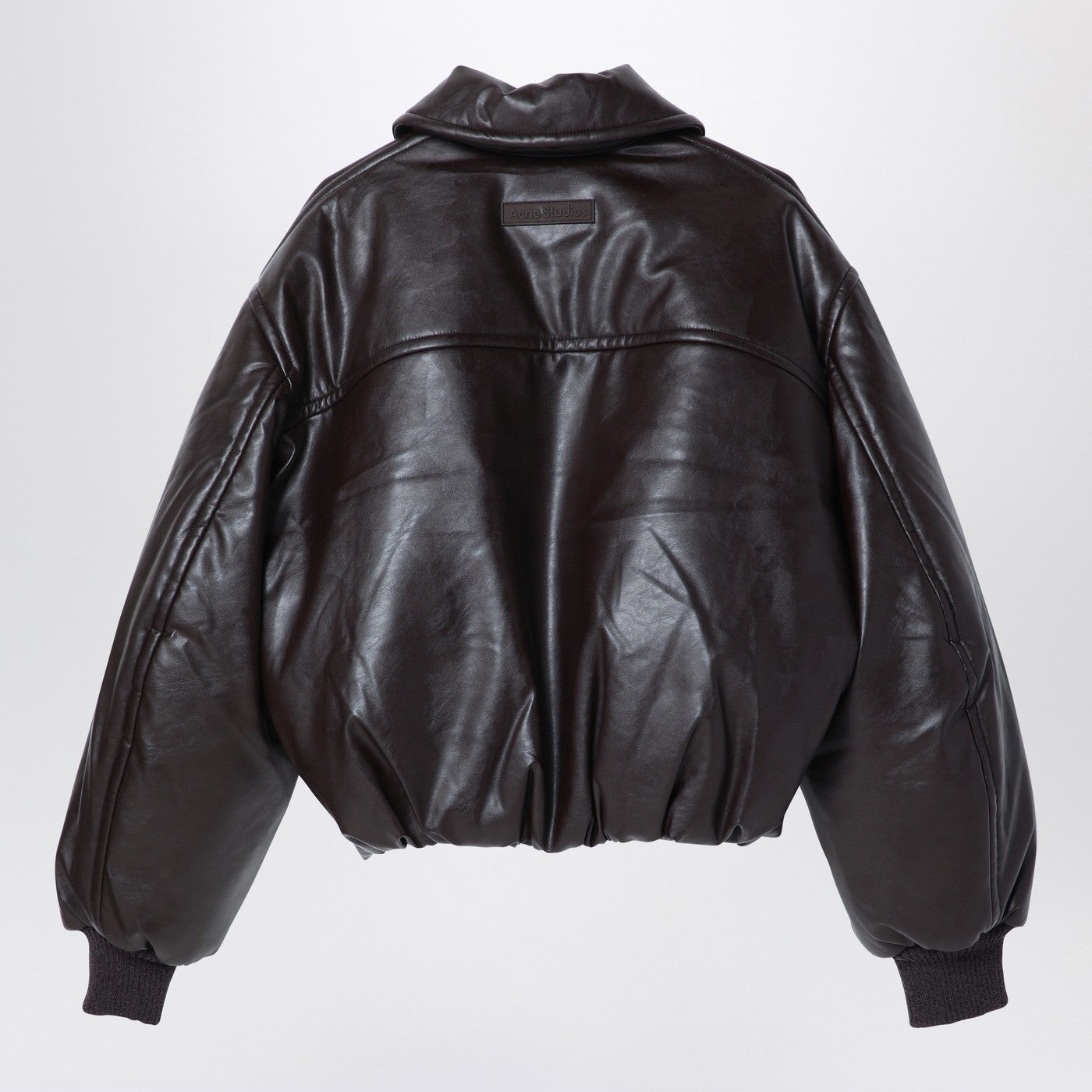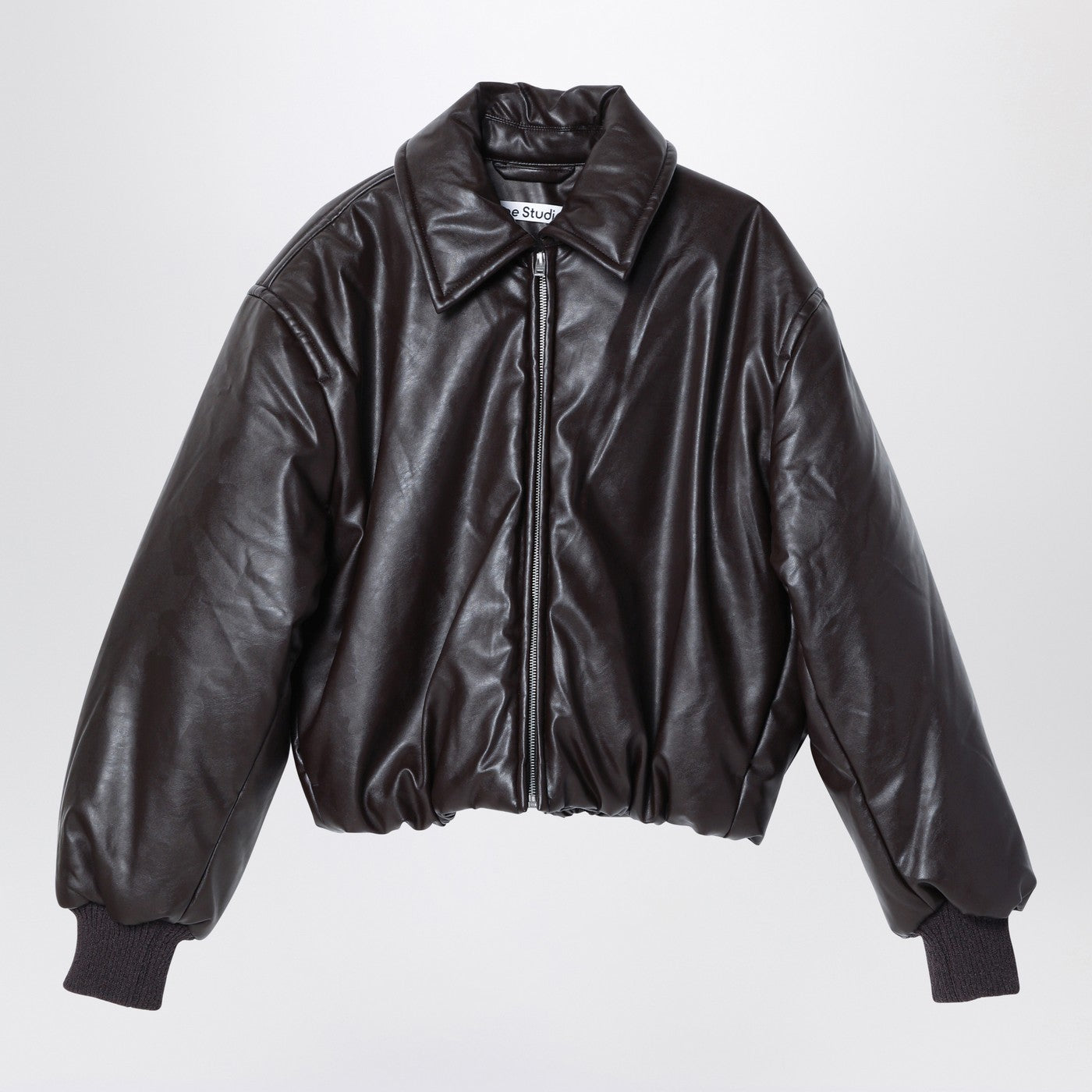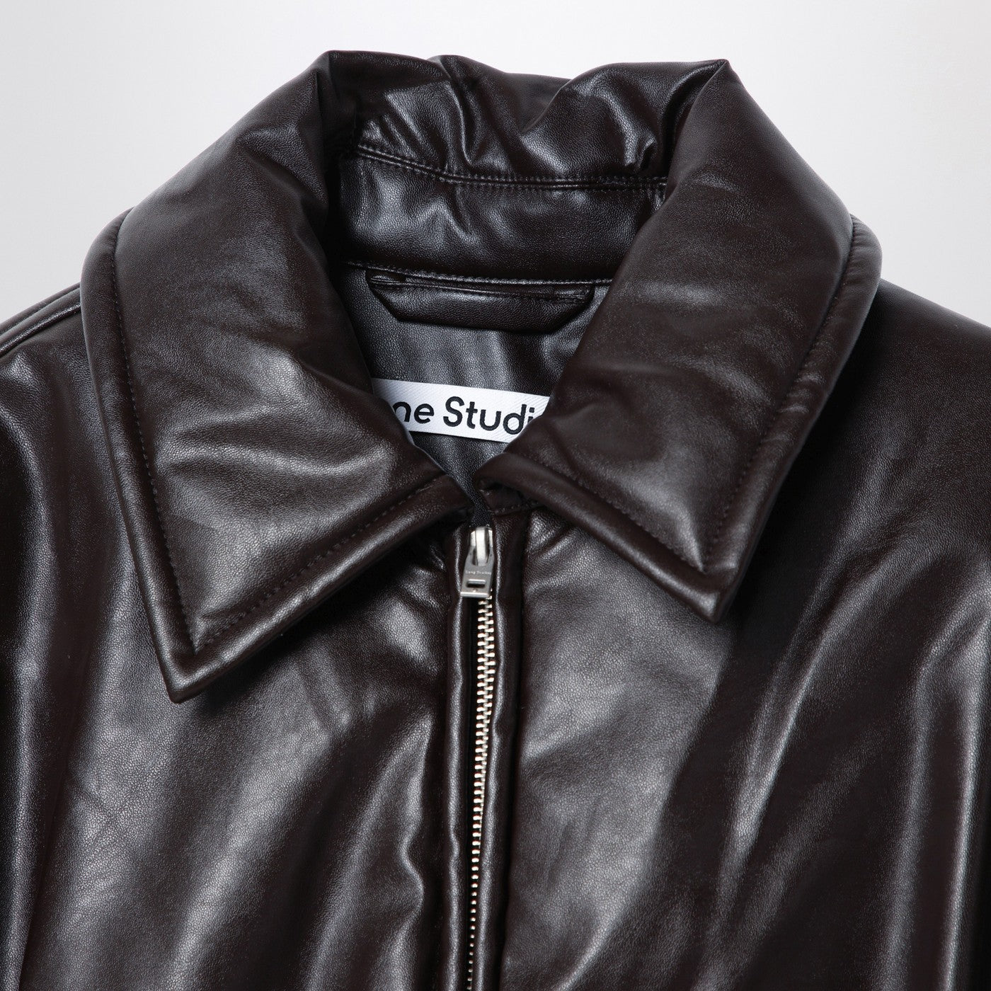 Brown faux leather bomber jacket from Acne Studios featuring a pointed collar, long sleeves with ribbed knit cuffs, a front zip fastening and a back logo patch.