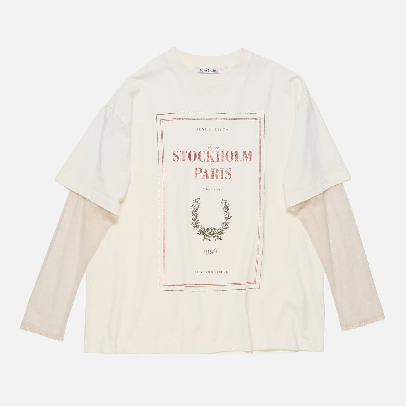 Wide t-shirt by Acne Studios in white cotton with a vintage effect, characterized by layered design, long mesh sleeves, print on the front, neckline, cuffs and hem with used effect and relaxed fit.