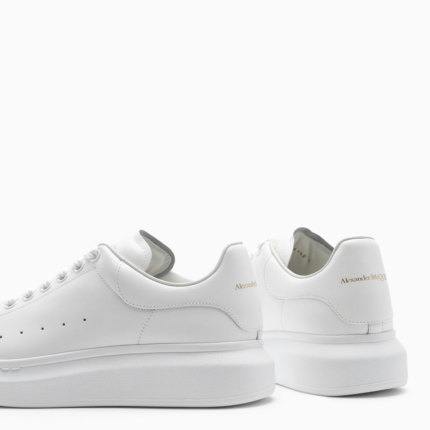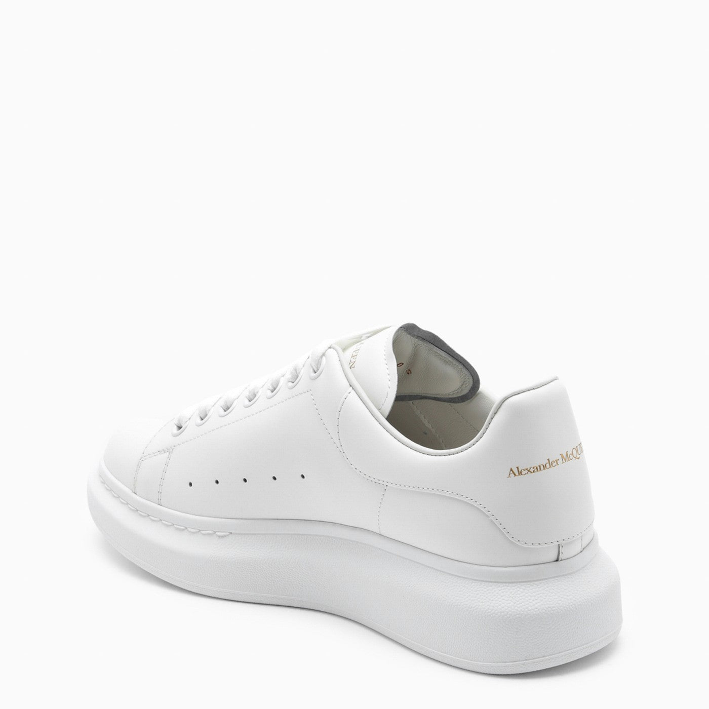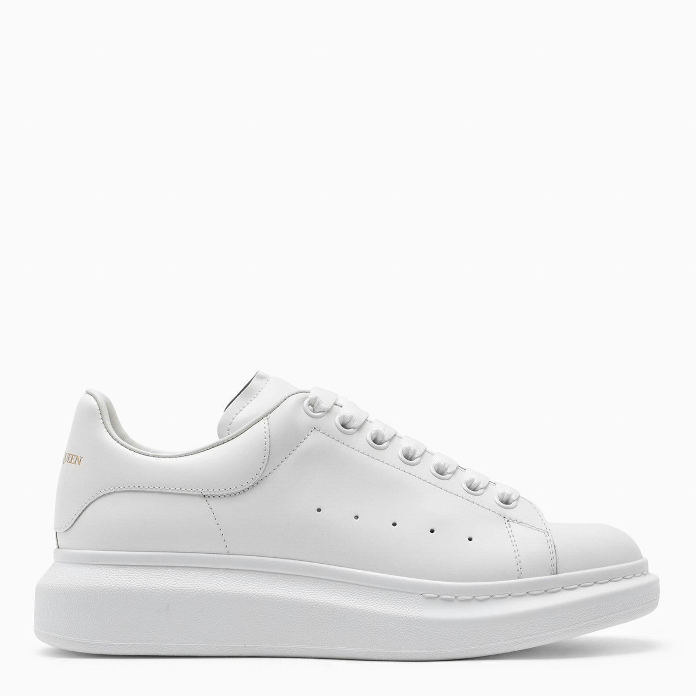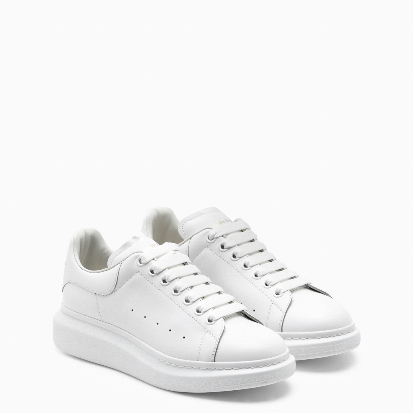 White smooth leather low top trainer from Alexander McQueen featuring a round toe and tonal leather detailing on the heel. The model features flat white wide laces and an Alexander McQueen logo on the tongue and heel. Finally, the model features an oversized rubber sole. The laces may differ from those in the product image.