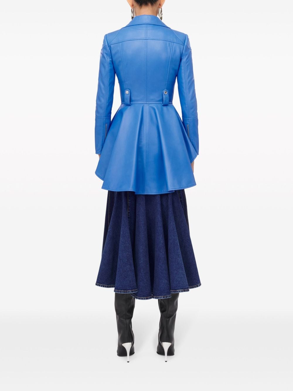 medium blue stretch-cotton denim high-waisted belt loops concealed fly and button fastening classic five pockets whiskering effect front slit calf-length