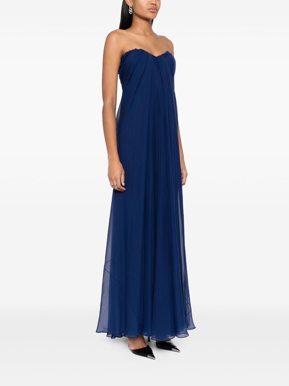 sapphire blue silk flared semi-sheer overlay draped detailing sweetheart neck bustier-style neckline concealed rear zip fastening strapless lettuce hem ankle-length