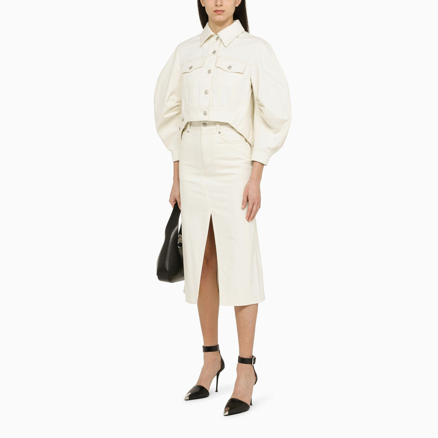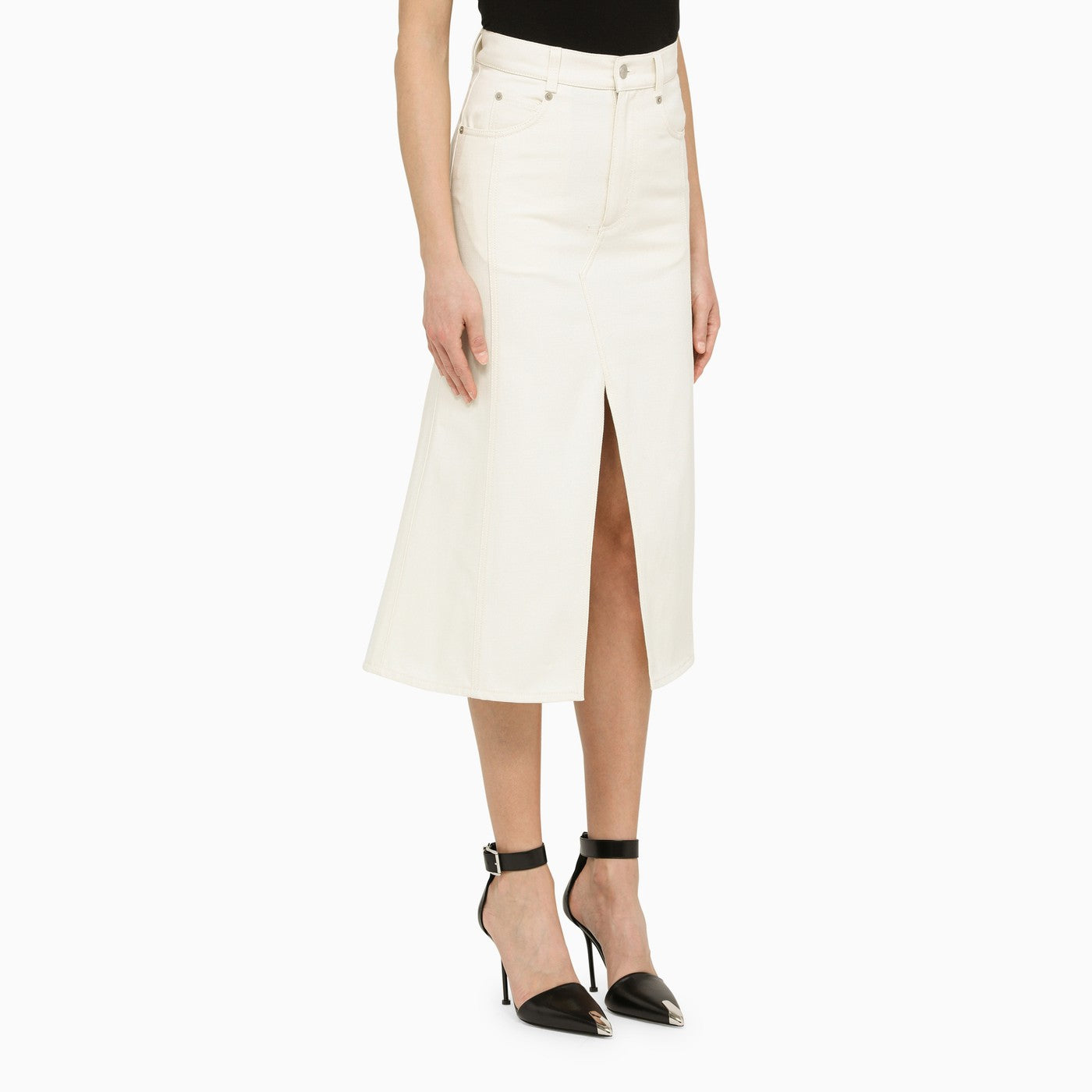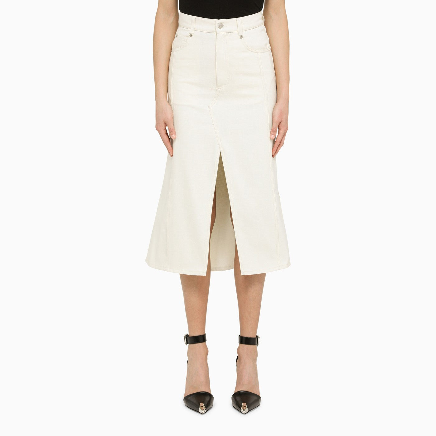 Ivory cotton denim midi skirt from Alexander McQueen featuring a wide front slit, three front pockets and a sewn-on logo patch on the back.