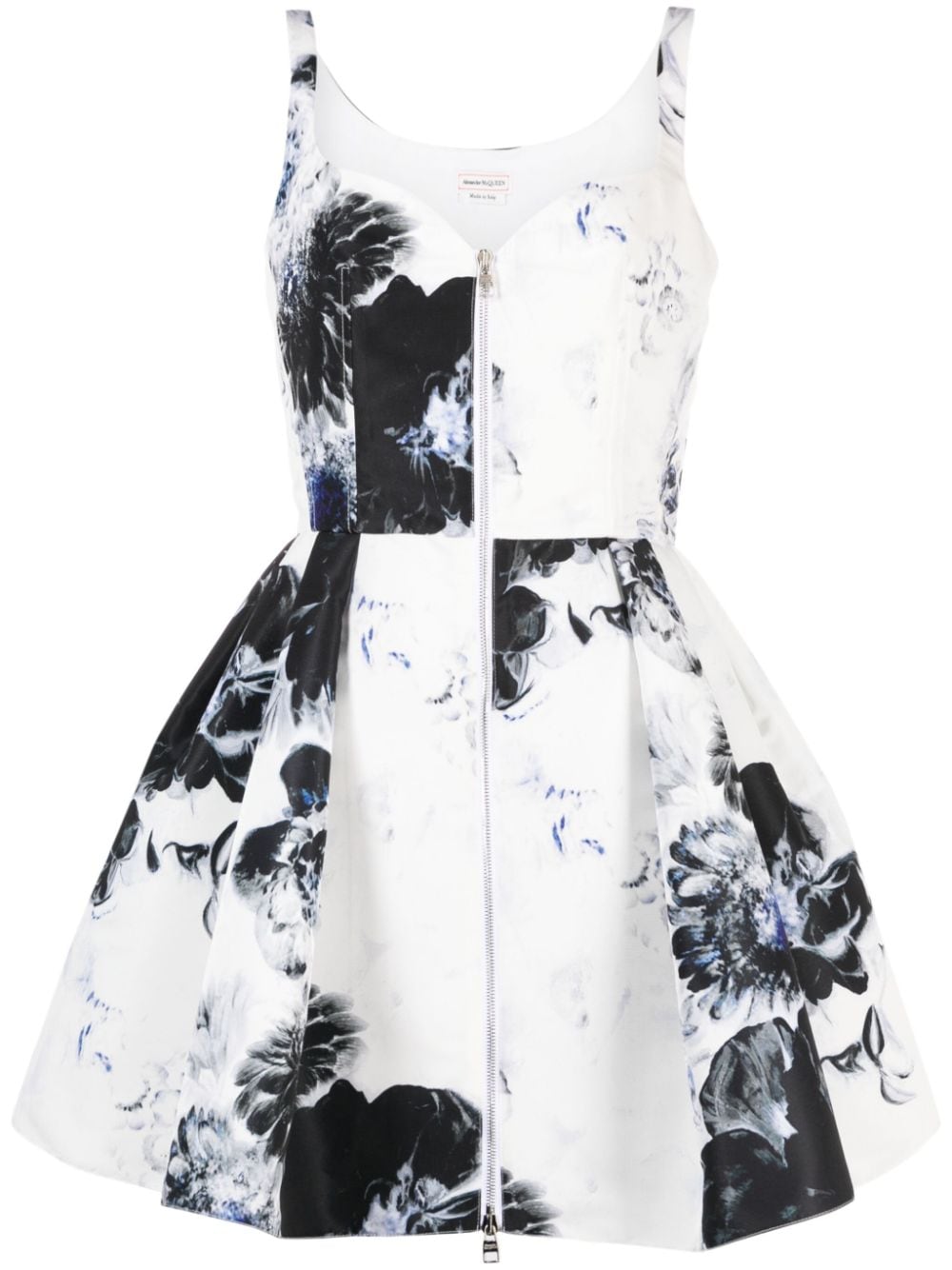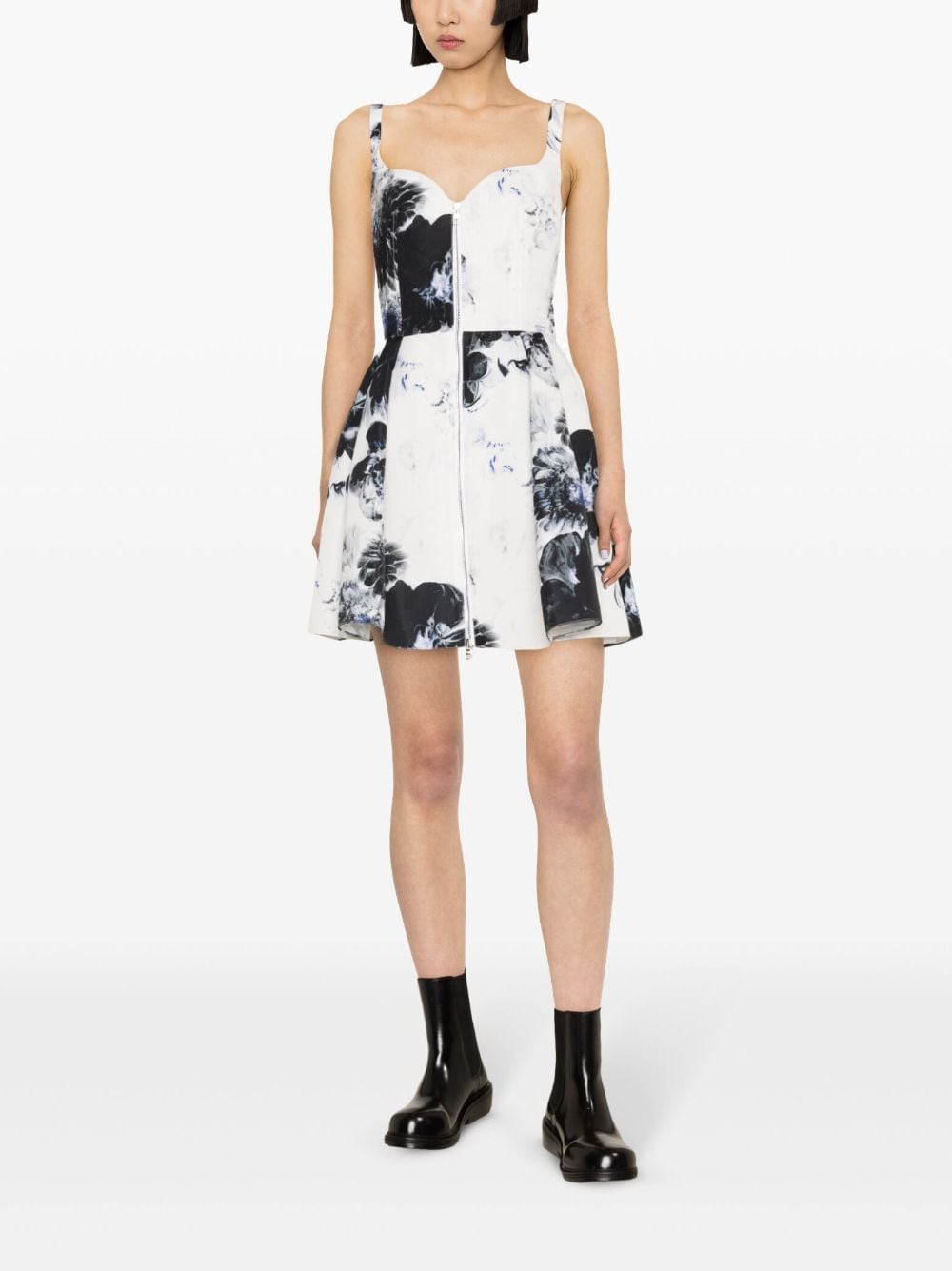 white/black satin finish all-over floral jacquard seam detailing sweetheart neck front two-way zip fastening sleeveless fitted waistline pleated skirt two side slit pockets above-knee length