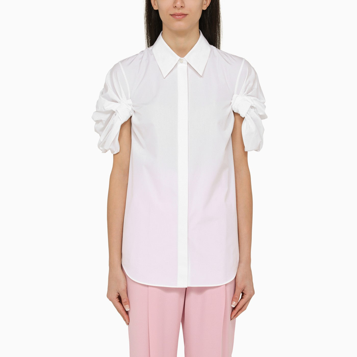 White cotton shirt from Alexander McQueen featuring a classic pointed collar, short sleeve detailing, a concealed front button fastening and a straight hem.