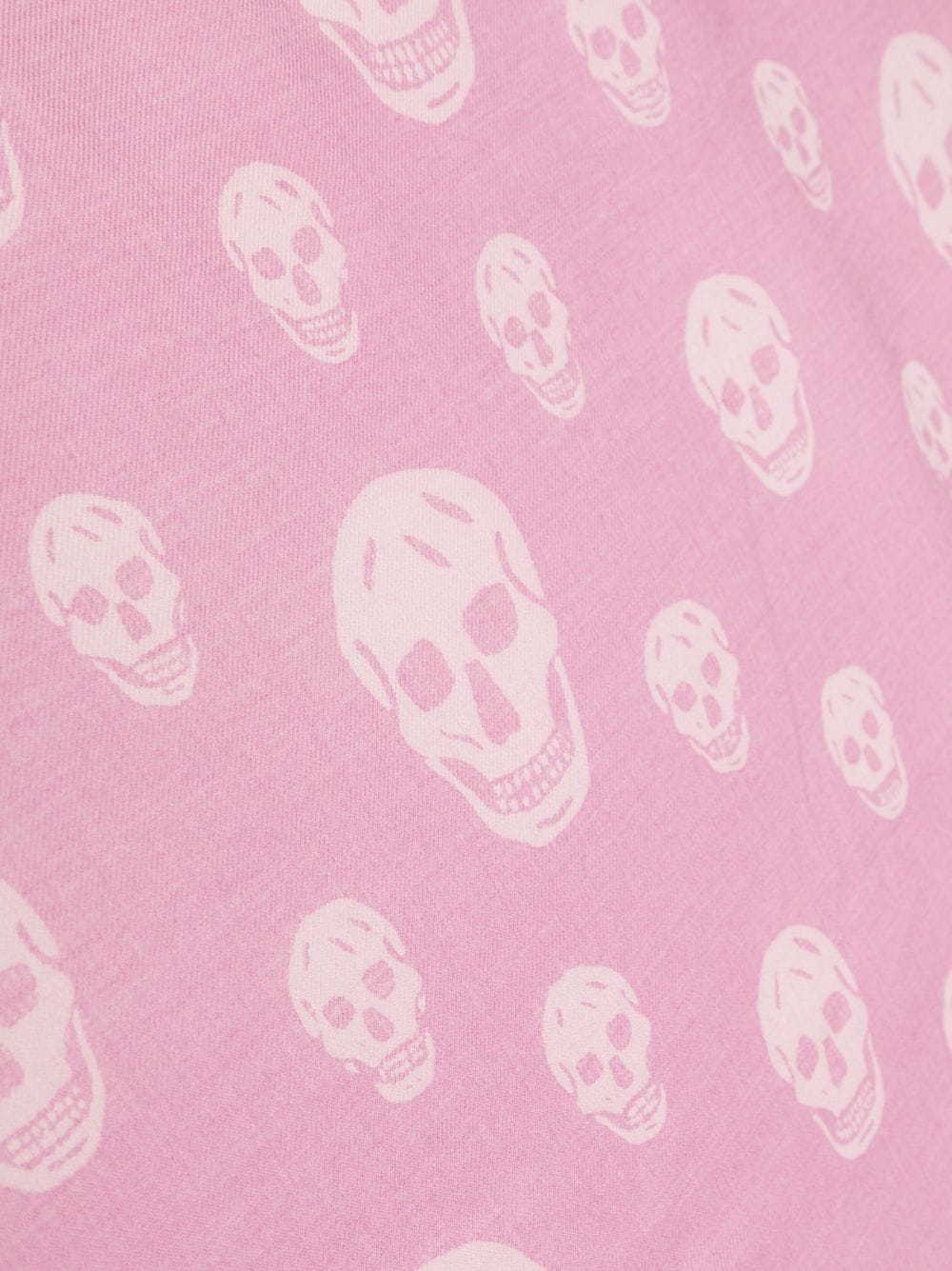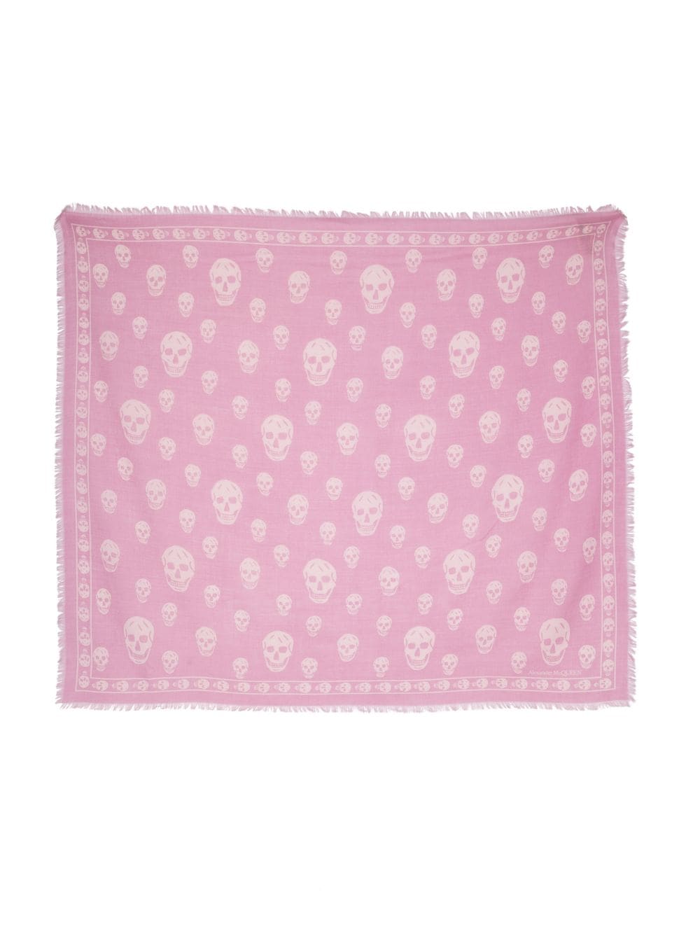skull-motif fringed-edge scarf from Alexander McQueen featuring pink, wool, skull print, square shape and fringed edge.