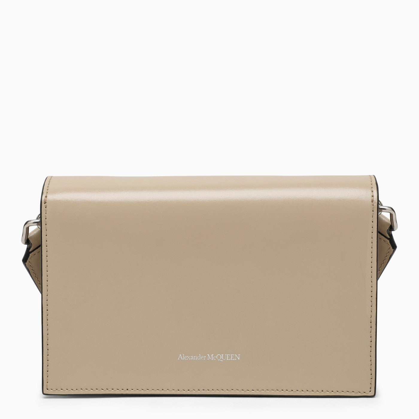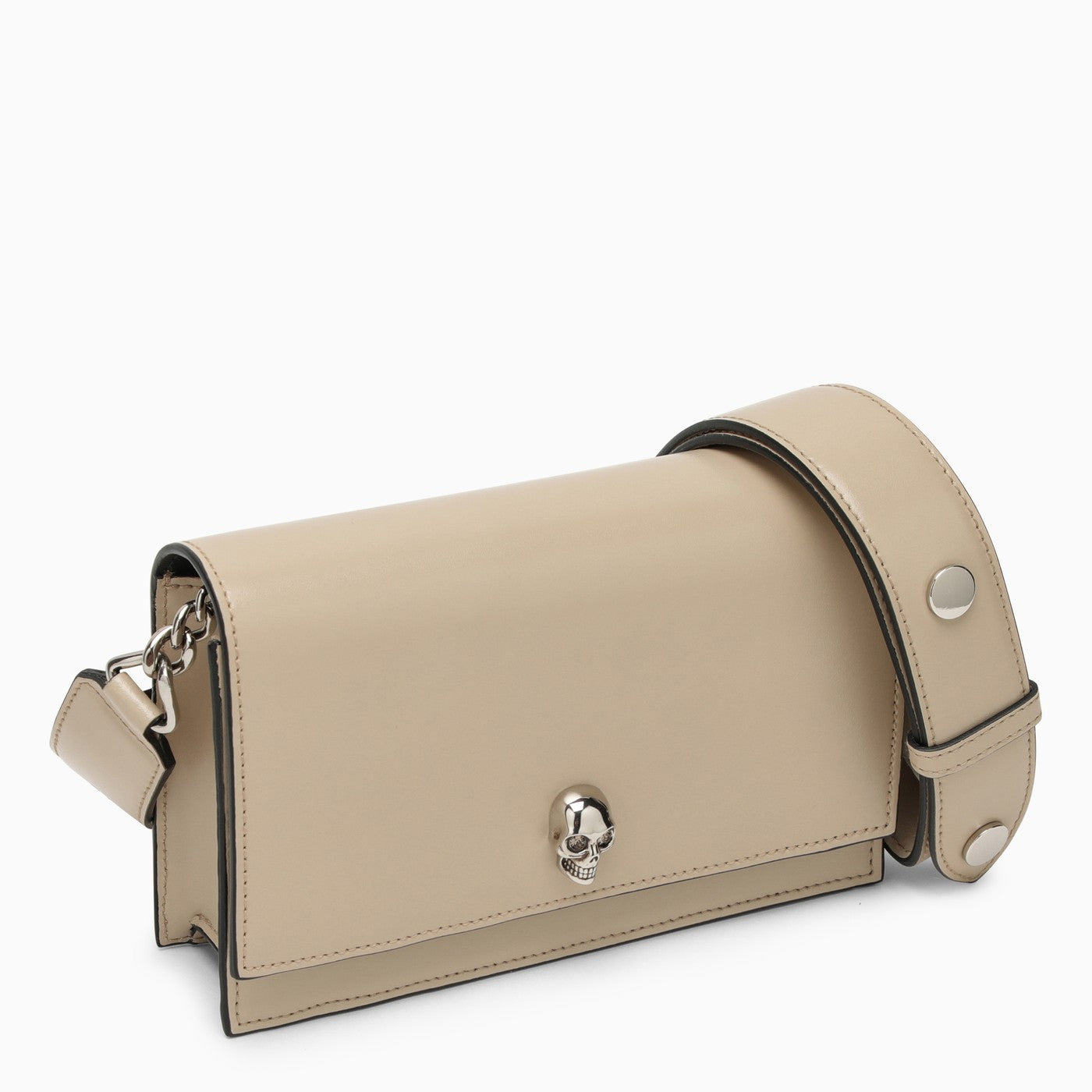 Beige smooth leather small bag from Alexander McQueen featuring a metallic skull on the front with Swarovski crystals, magnetic closure flap, leather and chain shoulder strap, interior flat pocket, silver-tone metal hardware and contrasting interior.