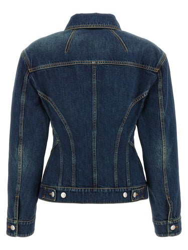Cotton denim jacket with front button closure, contrast stitching, long sleeves with cuffs and button.