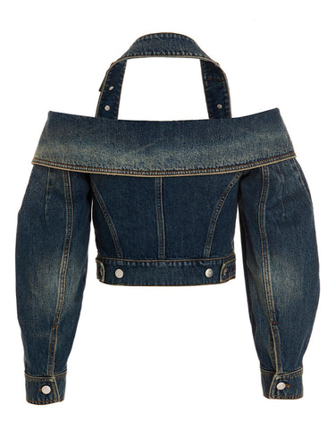 Halter' cotton denim jacket with n off-the-shoulder style, adjustable shoulder straps, button closure, long sleeves and a cropped style.