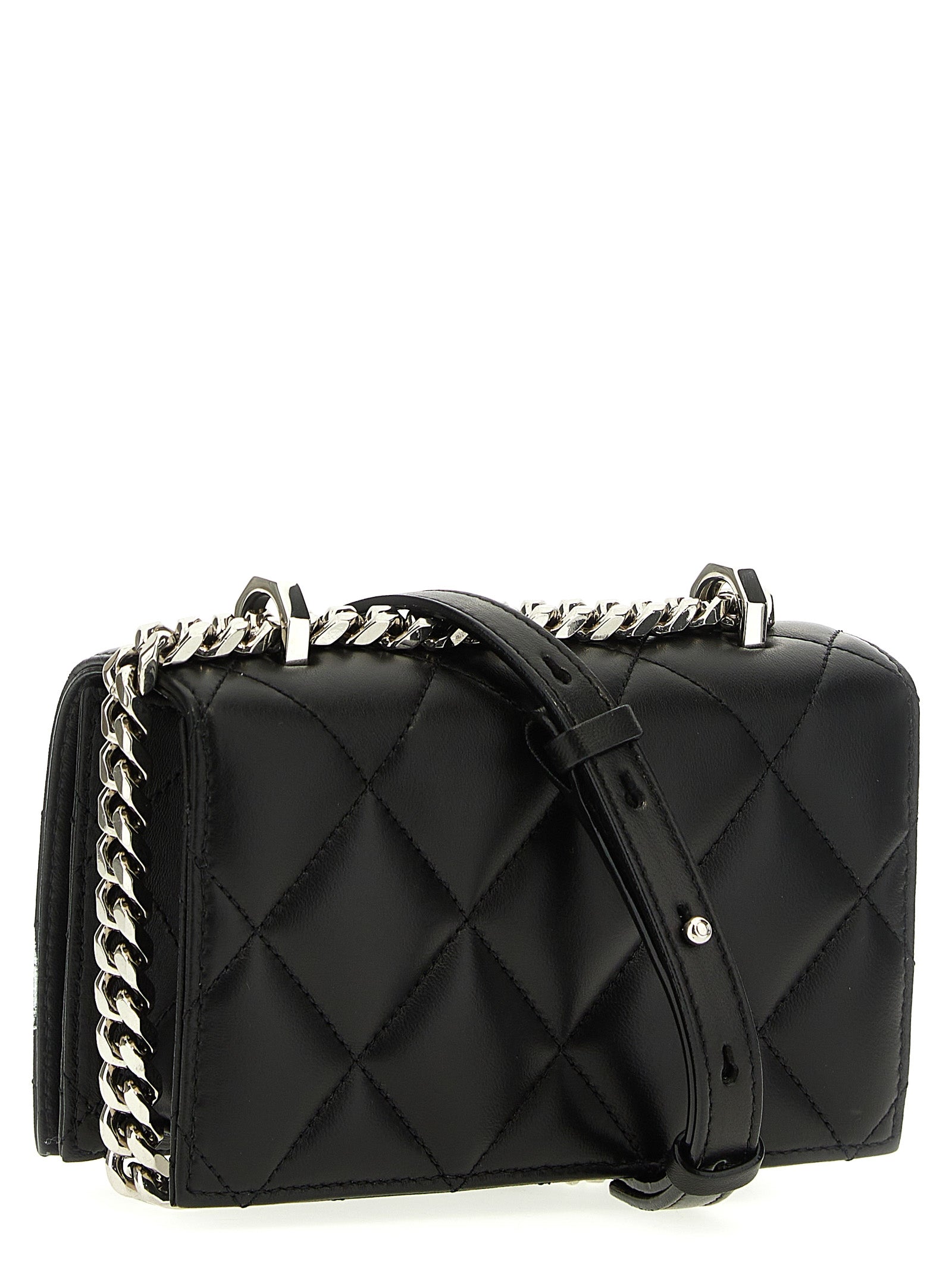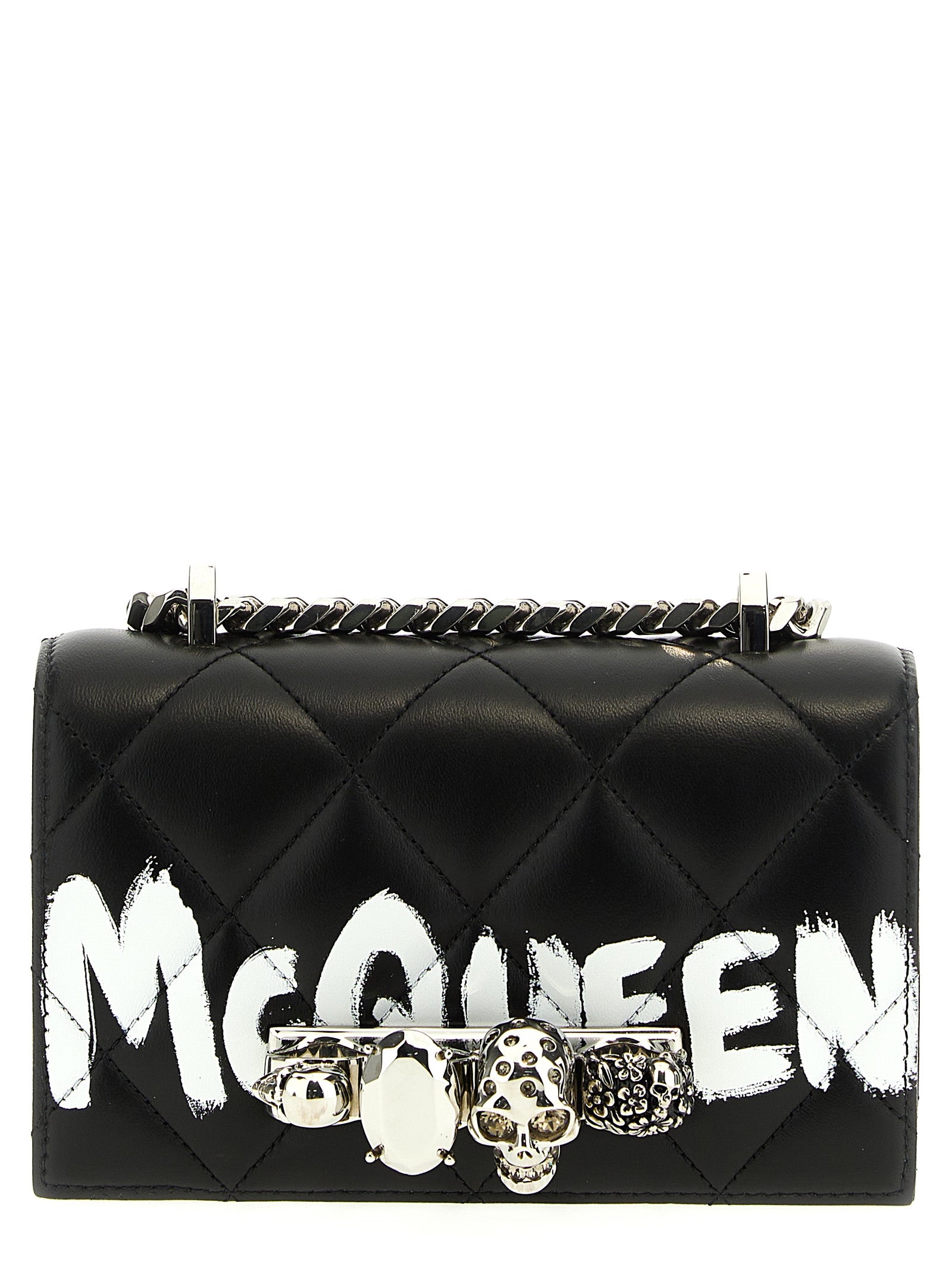 Quilted nappa leather Mini Jewelled Satchel crossbody bag with contrast McQueen Graffiti logo print, magnetic closure, four silver rings with front Swarovski crystals, chain shoulder strap and adjustable leather.